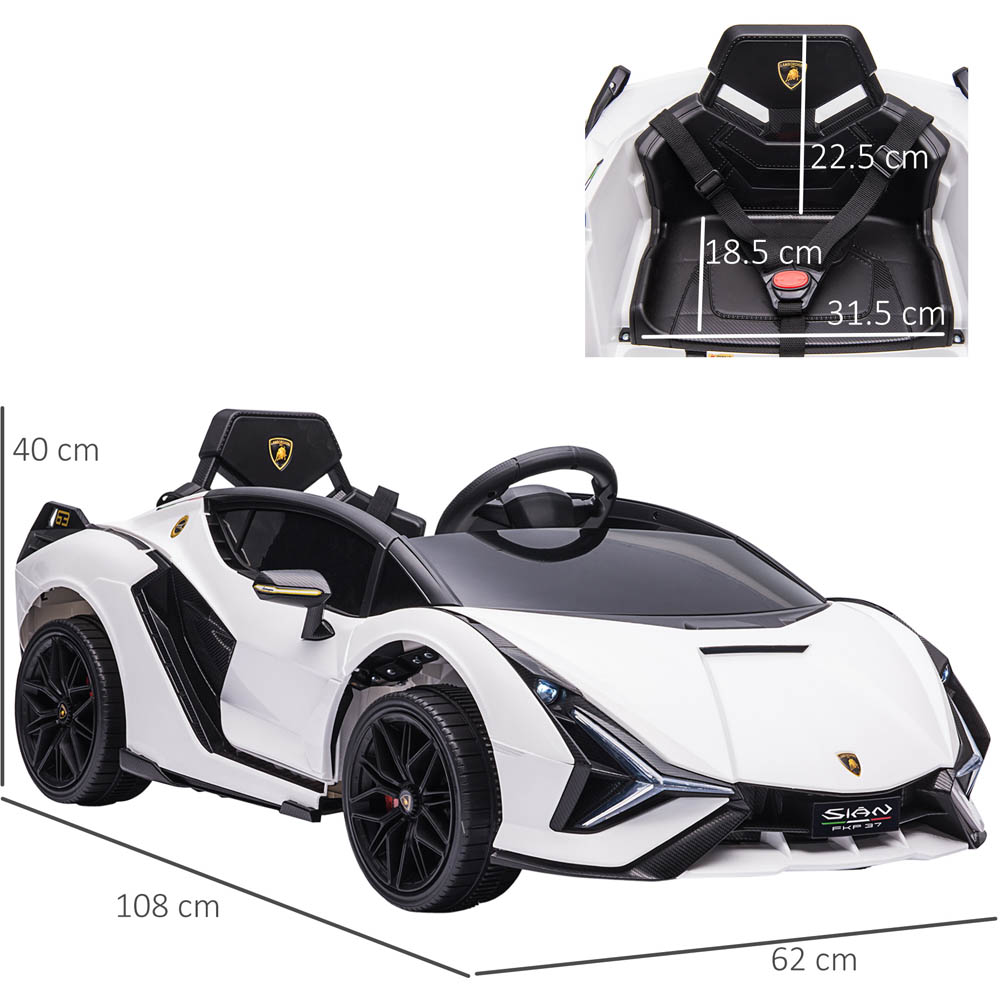 Fun and safe driving for children starts with the Tommy Toys Lamborghini Sian Kids Ride-On Electric Car in white. This cool officially licensed Lamborghini Sian is a super cool addition to your child's toy collection. Packed with functions, it features working headlights and tail lights, a steering wheel, movement pedals and a music player. Ensuring safety, the wide tyres offer a smooth ride, and the car includes a seatbelt for protection. Also, the dual motor structure gives more power with a maximum speed of 8km/h. Plus, it is simple to transport while the vehicle is without power, thanks to the handle attachment and auxiliary wheels. This ride-on car is powered by a 12V rechargeable battery. Suitable for three to five-year-olds.
