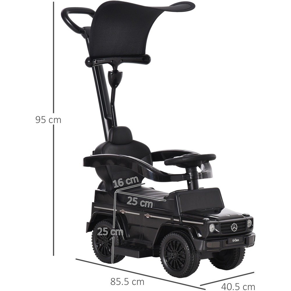 Give children this impressive Tommy Toys Mercedes-Benz Baby Ride On Push Car in black. Officially licensed Mercedes design adds to the extra fun. Features a moving steering wheel and horn, it gives your children a realistic effect. The seat with backrest is comfortable and supportive, with the outer guardrail ensuring safety. Also, it comes complete with a top canopy so they don't get burnt by the sun whilst cruising outdoors. Stylish 3-in-1 design - can be used as a walker, slider and push ride-on. Suitable for ages 12 to 36 months.