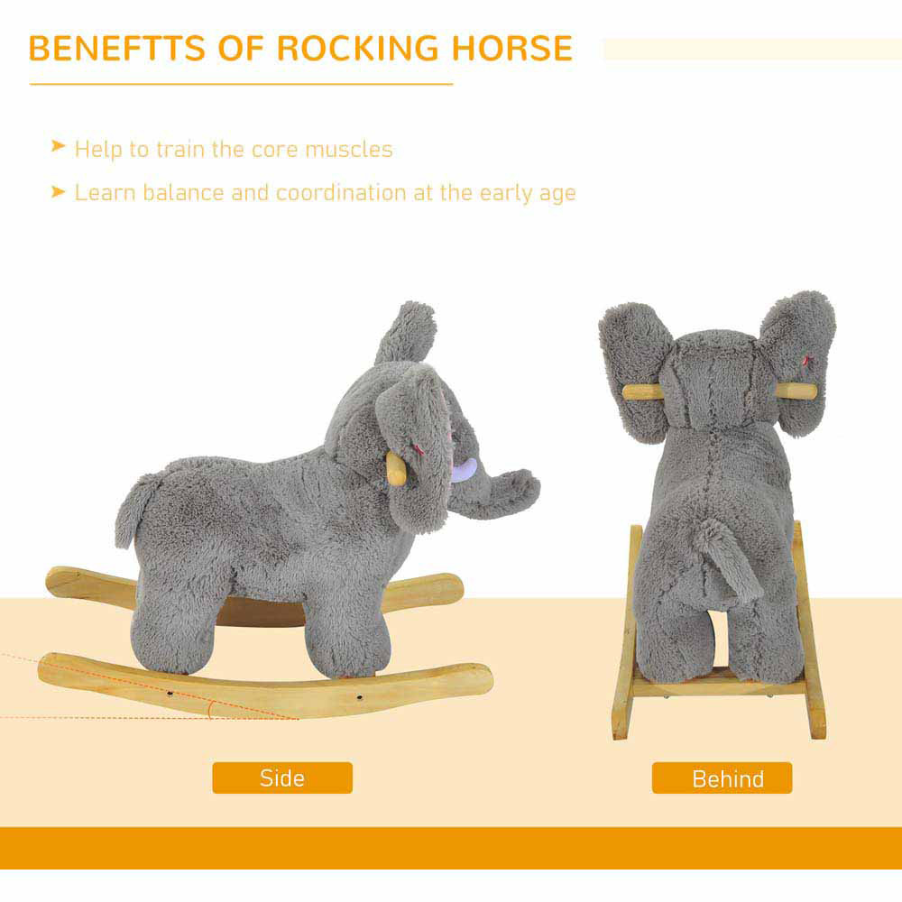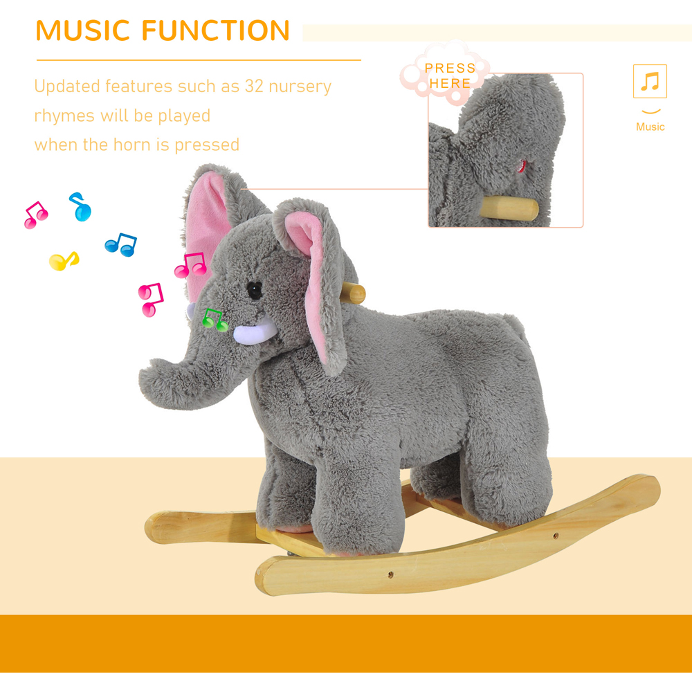 This Tommy Toys Rocking Elephant Baby Ride-On in grey is a great toy for your child, with its ability to rock and play pre-recorded songs when you or your child presses the elephant ear. Made from a metal structure and wooden base it is very stable and it is covered with a plush material. Also, this toy combines an elephant shape with updated features such as 32 nursery rhymes will be played when the ears are pressed. (3 LR44 batteries included).