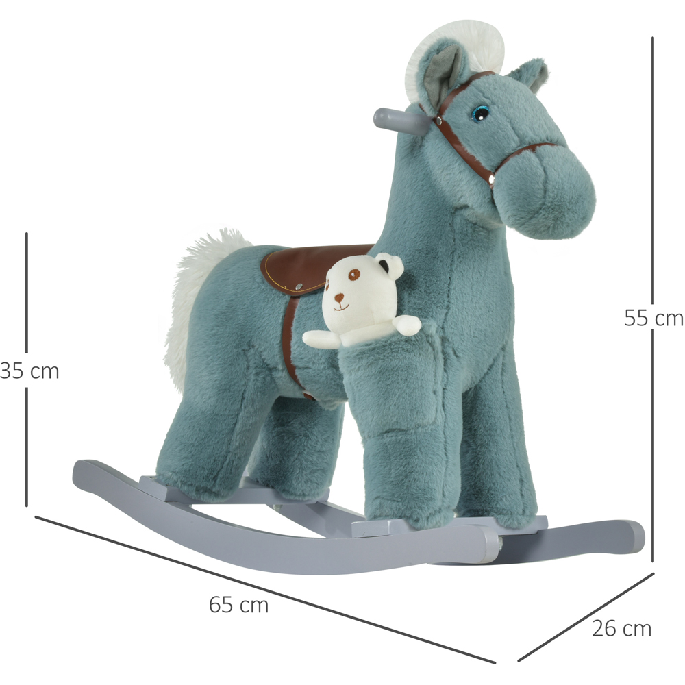 Rock the day away in sheer cuteness with this Tommy Toys Rocking Horse Pony Baby Ride On in blue. This colourful character is padded all over so it's completely soft to the touch, with a seat and handlebars fitted so they can sit comfortably and hold on safely. On the is the wooden base, which is perfectly curved so it moves forwards and backwards gently - no bumps whilst being used by children. Press the ears, and it'll make neighing and galloping sounds for extra fun. It comes with a cute bear which has its own pocket to rest in. Also, the solid bottom is smoothly curved so the horse rocks gently backwards and forwards. Plus, the metal frame of the horse upper ensures shape is kept intact. Suitable for ages 18-36 months.