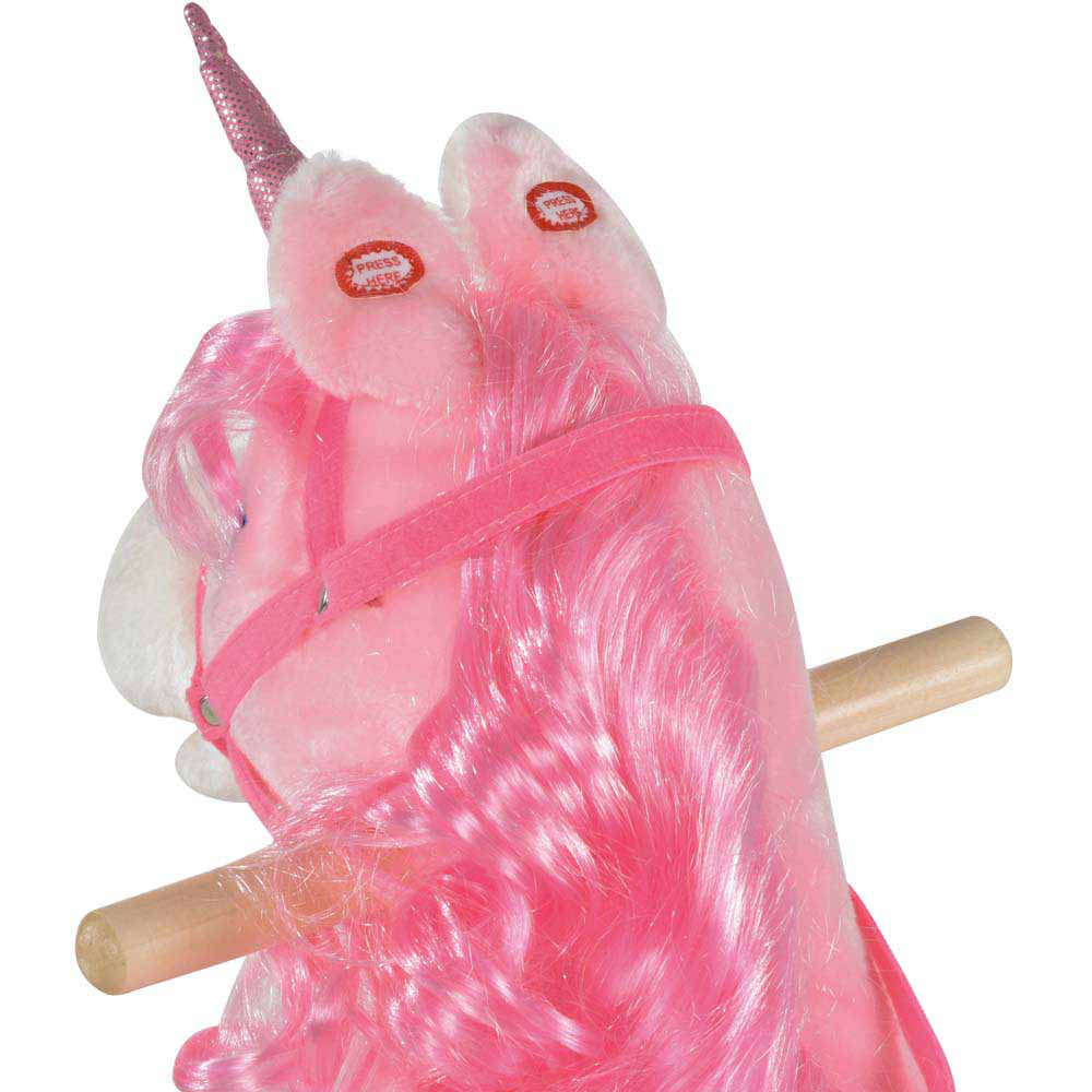 Unleash the magic of playtimes with this Tommy Toys Rocking Horse Unicorn Toddler Ride-On in pink. It's made with an abundance of fun and interactive features your sweetie will adore - a moving mouth, wagging tail and neighing and galloping sounds via the press of a button. Using solid metal for the main frame, the horse is covered with soft and plush fabric in pink and white, featuring a large saddle seat for them to sit comfortably and rein for them to hold on. The wood rocking bottom ensures smooth gliding back and forth, and it's finished with a pink mane of hair of extra cuteness. Requires 2 x AA batteries required (included).