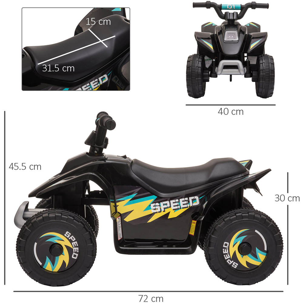 Give children their own vehicle with this Tommy Toys Toddler Ride On Electric Quad Bike in black. This ride-on features a powerful 6V battery, four wear-resistant wheels, and forward and reverse functions to provide a complete driving experience. Easy to use, thanks to the start/stop button, operating the ride-on is just bliss, perfect for young explorers who want a taste of adventure. Also, the adjustable speed range between 2.8 to 4.6km/h gives children a good speed to ride without going too fast. Plus, the handlebars and large seat ensure comfortable use. Suitable for ages 18 to 36 months.