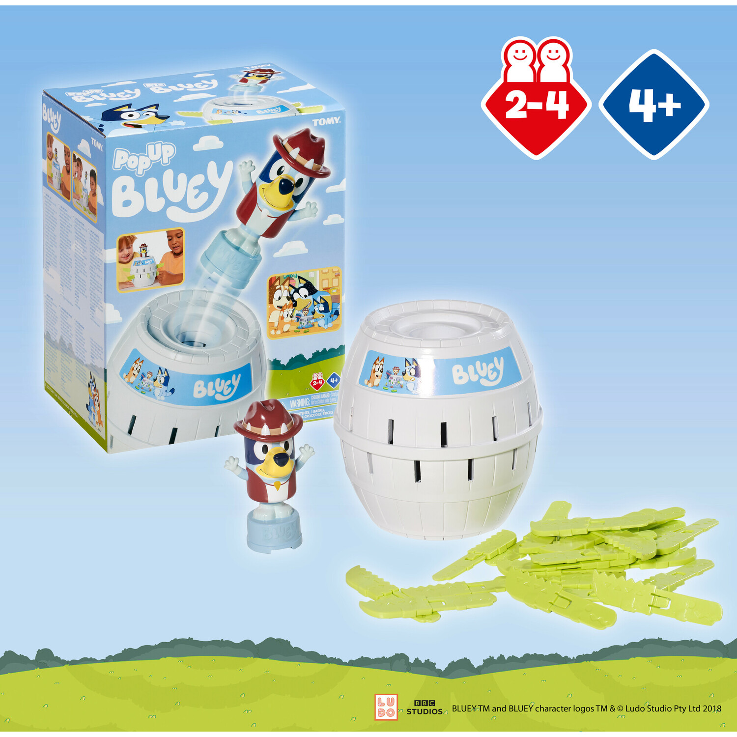 Join the fun with the Tomy Pop Up Bluey Game. Can you keep Bluey from jumping out of the barrel? Slide crocodile swords into the barrel and try not to make Bluey pop. This classic children’s game is perfect for ages four and above and makes a fantastic gift for kids to play with friends, adults, or family.