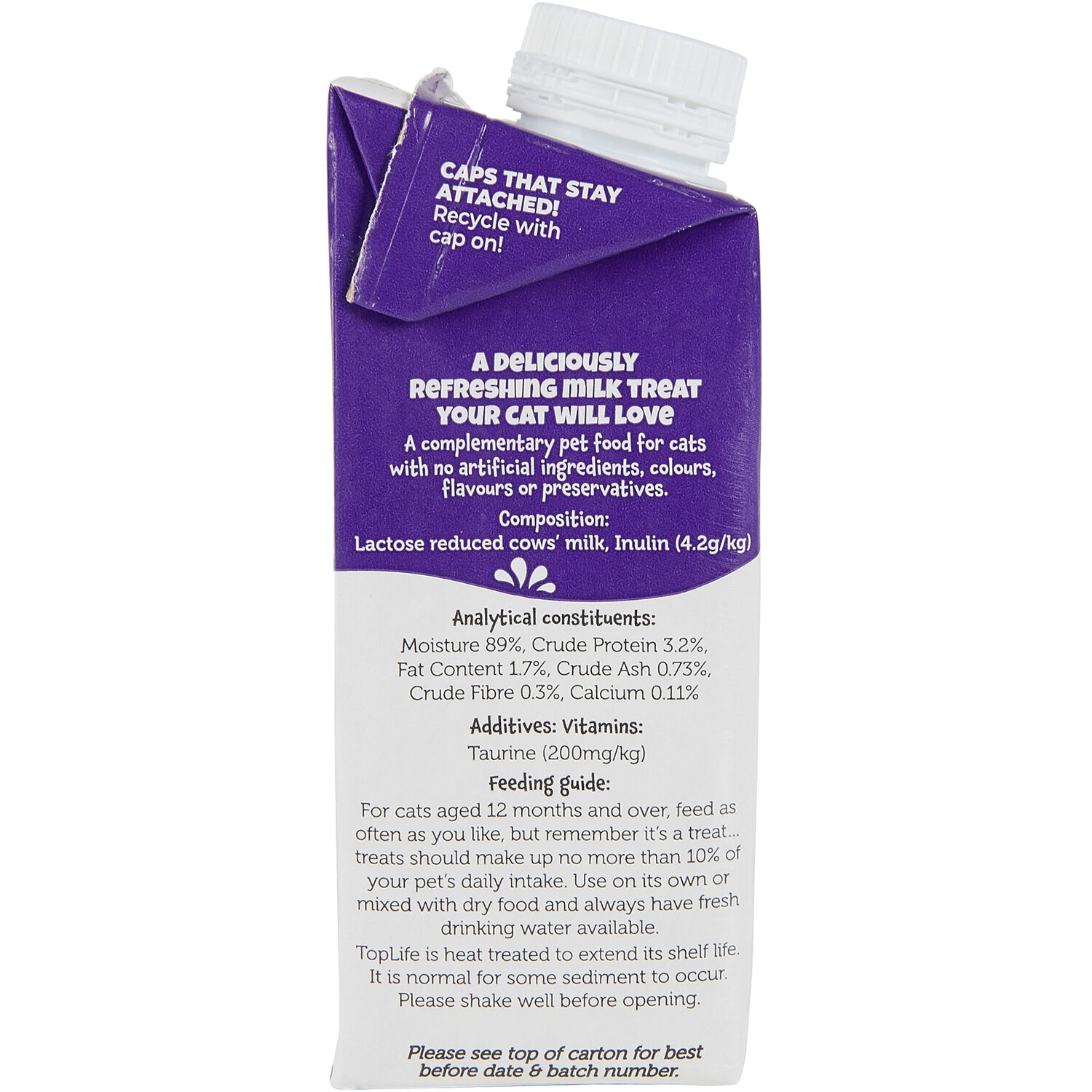 TopLife Milk for Cats is a delicious daily treat for your feline friend made from highly digestible lactose-reduced cow's milk. Keep your pet hydrated with this delicious kitty milk, containing inulin and added taurine. A tasty treat for your kitty, this is sure to keep your pet purring for a while!