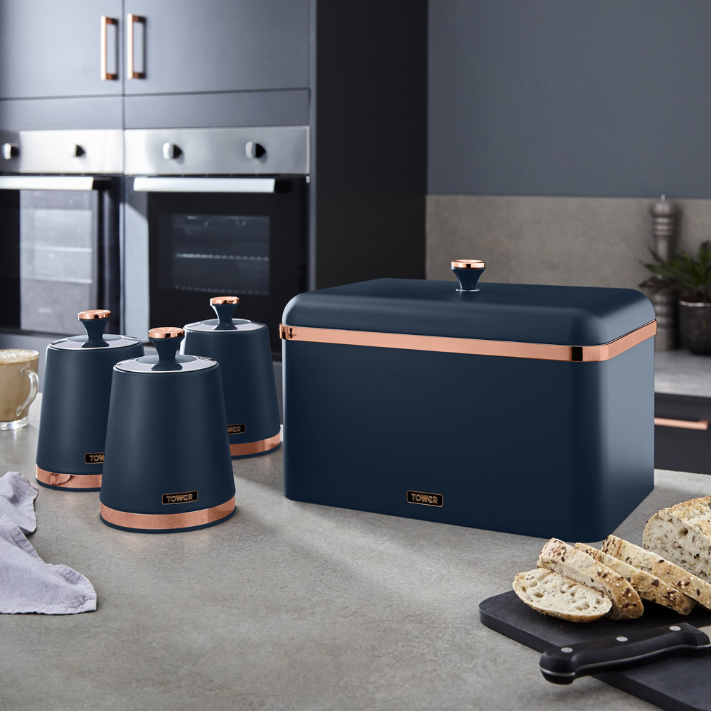 Wrapped in a staple design feature for today's modern home, the durable carbon build of the three-piece Cavaletto Black Canister Set from Tower locks in the freshness of your chosen ingredients, while presenting a reliable and highly styled storage compartment for your teas, coffees and sugars. The carbon structure is finished with a coating of matte midnight blue, with rose gold tones for a tasteful finishing touch to compliment your kitchen environment. The removable lids provide maximum access to the inner 1.3L capacity for easily retrieving of the contents stored inside. Each canister requires only a simple wipe clean to make for easy maintenance of its on-trend finish.
