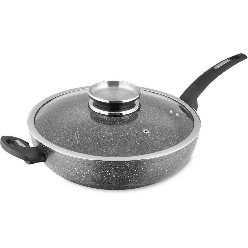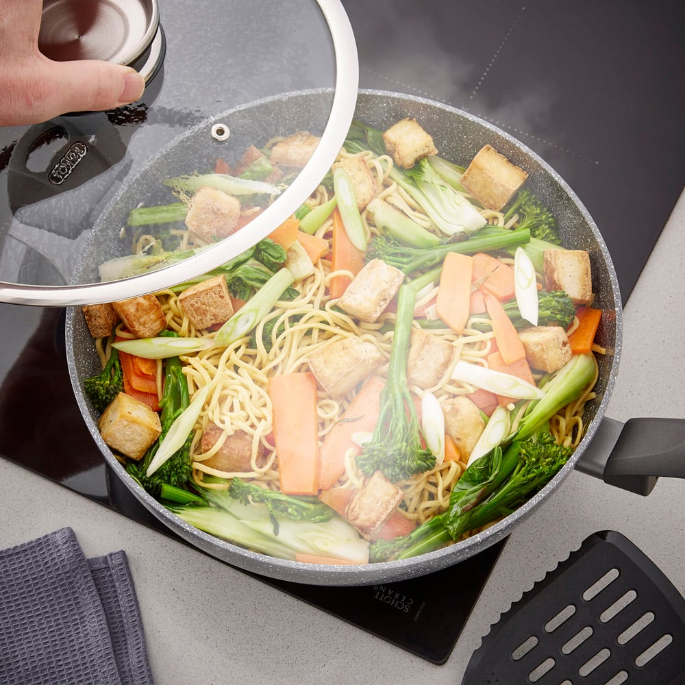 Cook deliciously sizzling fajitas and healthy stir-fry dishes with the Tower 30cm Forged Wok in graphite. Featuring high-grade non-stick technology, the Cerastone coating is five times stronger than other non-stick coatings and is PFAS, PFOA, PTFE, lead and cadmium-free so you can enjoy healthy meals using little or no oil. Its high quality, long-lasting forged aluminium body enables quick and easy adjustment of temperatures for more efficient cooking results, with no hot spots. The wok has a softtex handle and helper handle for comfortable control over your cooking, with an infuser lid that helps lock in and add extra flavour to your dishes. Its bonded steel base provides even heat distribution to ensure your food is cooked thoroughly and is designed to work with any hob type including induction. The non-stick ceramic coating prevents food from sticking to the surface, and this wok is dishwasher safe for an even easier cleaning after cooking.