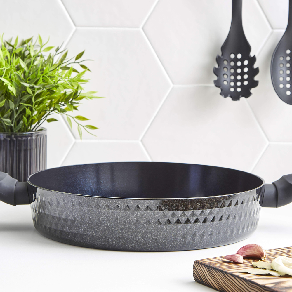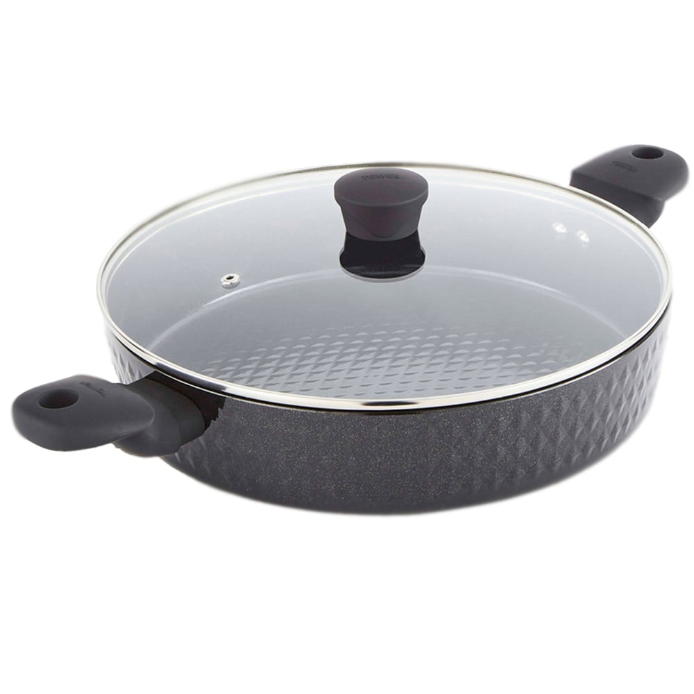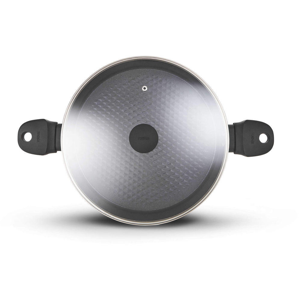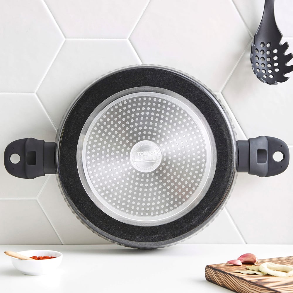Indulge in culinary creativity with this Tower 30cm Shallow Casserole. Cook deliciously wholesome, slow-cooked casseroles and hearty stews with the 30cm shallow casserole dish. Featuring high-grade non-stick technology, the black diamond ceramic coating is seven times stronger than other non-stick coatings and is PFAS, PFOA, PFTE, lead and cadmium-free for you to enjoy healthy meals using little or no oil. Its high quality, long-lasting forged aluminium body enables quick and easy adjustment of temperatures for more efficient cooking results, with no hot spots. The casserole dish has soft touch handles for comfortable control over your cooking, with a tempered glass lid that effectively seals in the heat to retain rich flavours and tender texture for perfect dishes. Its bonded steel base provides even heat distribution to ensure your food is cooked thoroughly and is designed to work with any hob type, including induction. The non-stick ceramic coating prevents food from sticking to the surface, and this casserole pot is dishwasher safe for an even easier clean after cooking.