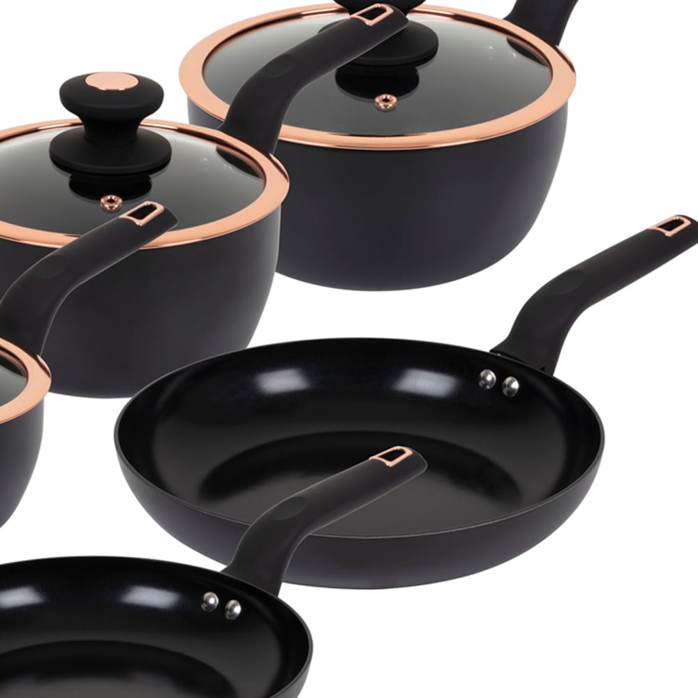 Create delicious, healthy fat-free meals with the Tower Cavaletto 5-piece Cookware set of 16cm, 18cm, 20cm saucepans and 24cm, 28cm frying pans. With superior Cerasure ceramic coating, each pan requires little to no oil for healthier cooking, with exceptional non-stick properties which leave little residue behind. Each pan features softtex handles in an elegant black and rose gold finish, for maximum comfort and style when cooking. It features a bonded steel base which is compatible with all hob types including gas cookers, electric hobs and induction set-ups. Each pan is crafted from pressed aluminium with expert heat transfer, for overall quicker and more efficient cooking. Plus, its aluminium body is free from PFOA, PFAS, PTFE, Lead and Cadmium.
