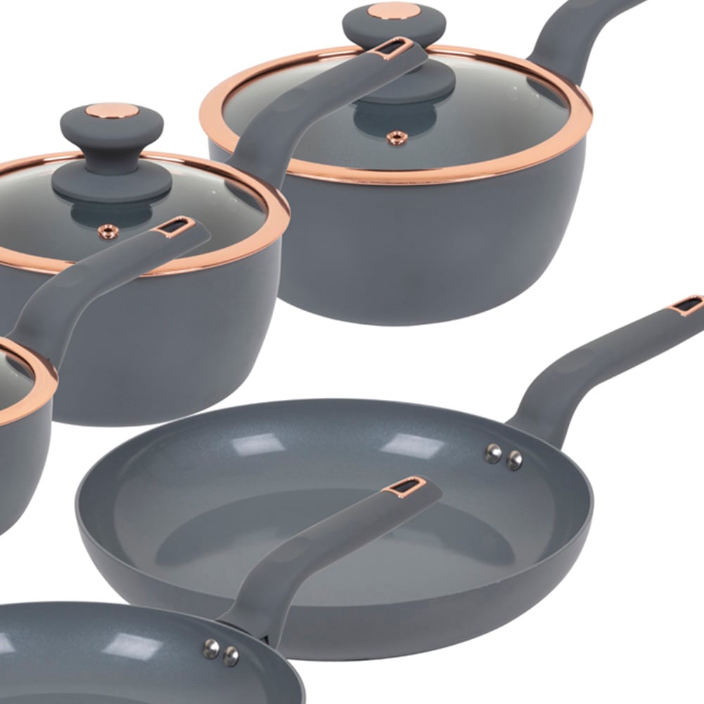 Create delicious, healthy fat-free meals with the Tower Cavaletto 5-piece Cookware set of 16cm, 18cm, 20cm saucepans and 24cm, 28cm frying pans. With superior Cerasure ceramic coating, each pan requires little to no oil for healthier cooking, with exceptional non-stick properties which leave little residue behind. Each pan features softtex handles in an elegant grey and rose gold finish, for maximum comfort and style when cooking. It features a bonded steel base which is compatible with all hob types including gas cookers, electric hobs and induction set-ups. Each pan is crafted from pressed aluminium with expert heat transfer, for overall quicker and more efficient cooking. Plus, its aluminium body is free from PFOA, PFAS, PTFE, Lead and Cadmium.