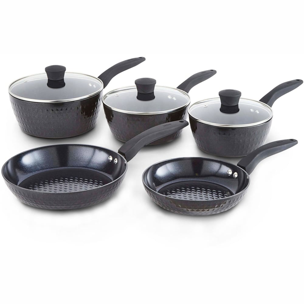 Introducing the Tower 5 Piece Cookware Set, the perfect collection of pans to meet all your kitchen needs. This set includes 18cm, 20cm, and 22cm saucepans with glass lids, as well as 20cm and 24cm frying pans. With its advanced non-stick technology, the black diamond coating is seven times stronger than other coatings, ensuring durability and longevity. Not only is it free from harmful substances such as PFAS, PFOA, PFTE, lead, and cadmium, but it also allows you to cook healthy, fat-free meals with minimal or no oil. The high-quality aluminium body of each pan ensures quick and even heat distribution, eliminating any hot spots and providing efficient cooking results. The ergonomic Softtex handle offers comfortable control while cooking. The bonded steel base guarantees even heat distribution, ensuring thorough cooking of your food. This cookware set is compatible with all hob types, including induction. The non-stick ceramic coating prevents food from sticking, making it easy to clean. In fact, this set is dishwasher safe, making clean-up a breeze.