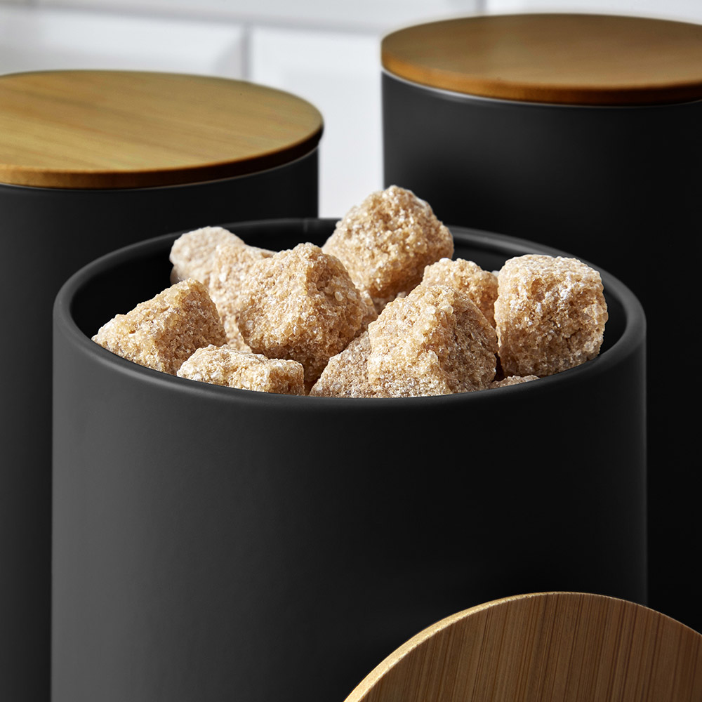 Accessorise your kitchen with the durable and decorative builds of the Scandi 5 Piece Storage Set from Tower. Complete with an iron-bodied bread bin, biscuit barrel and three-piece canister set, you can keep all of your baked items and loose ingredients stored away with longer-lasting freshness. Each piece features a Scandinavian-inspired black colouring, combined with natural bamboo-effect textures to complete your kitchen's minimalist look. Both stylish and practical, the bread bin's bamboo front can be completely detached for multi-functional use as a chopping board. The smooth iron structure makes this set easy to maintain using a damp cloth for faster cleaning. The canisters have air-tight lids, while the bread bin's top lid allows moisture to escape, ensuring all your ingredients and baked goods stay fresher for longer.