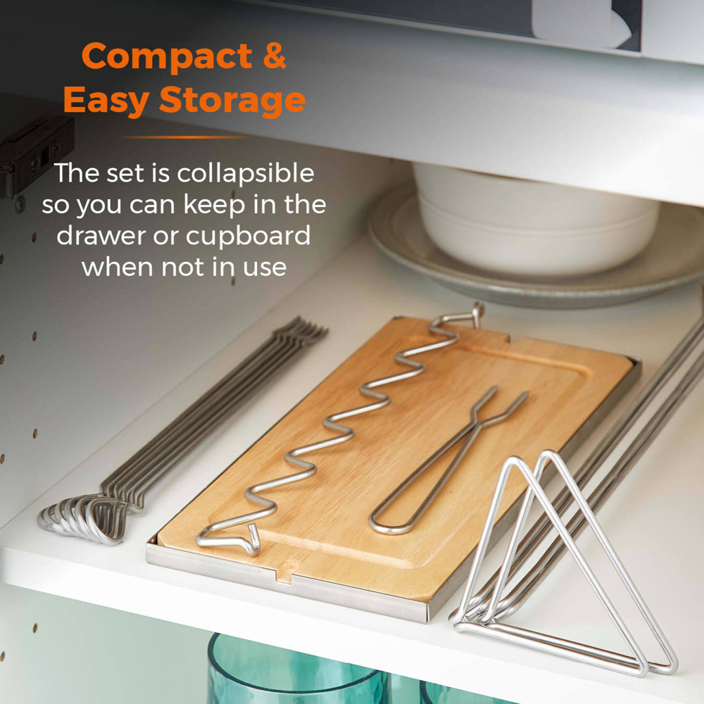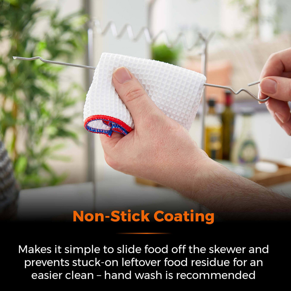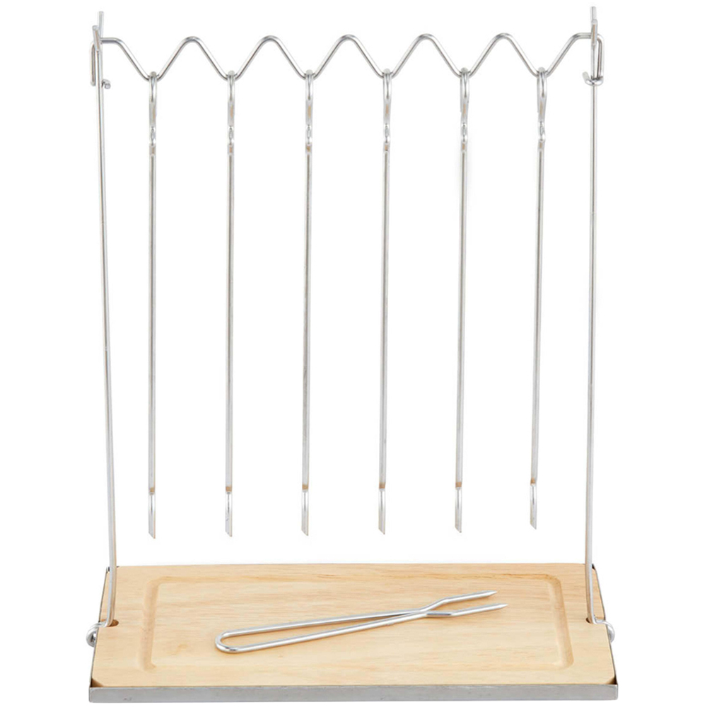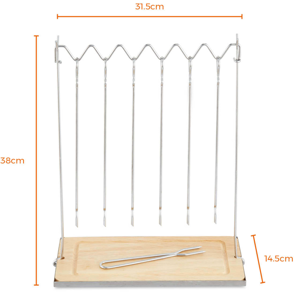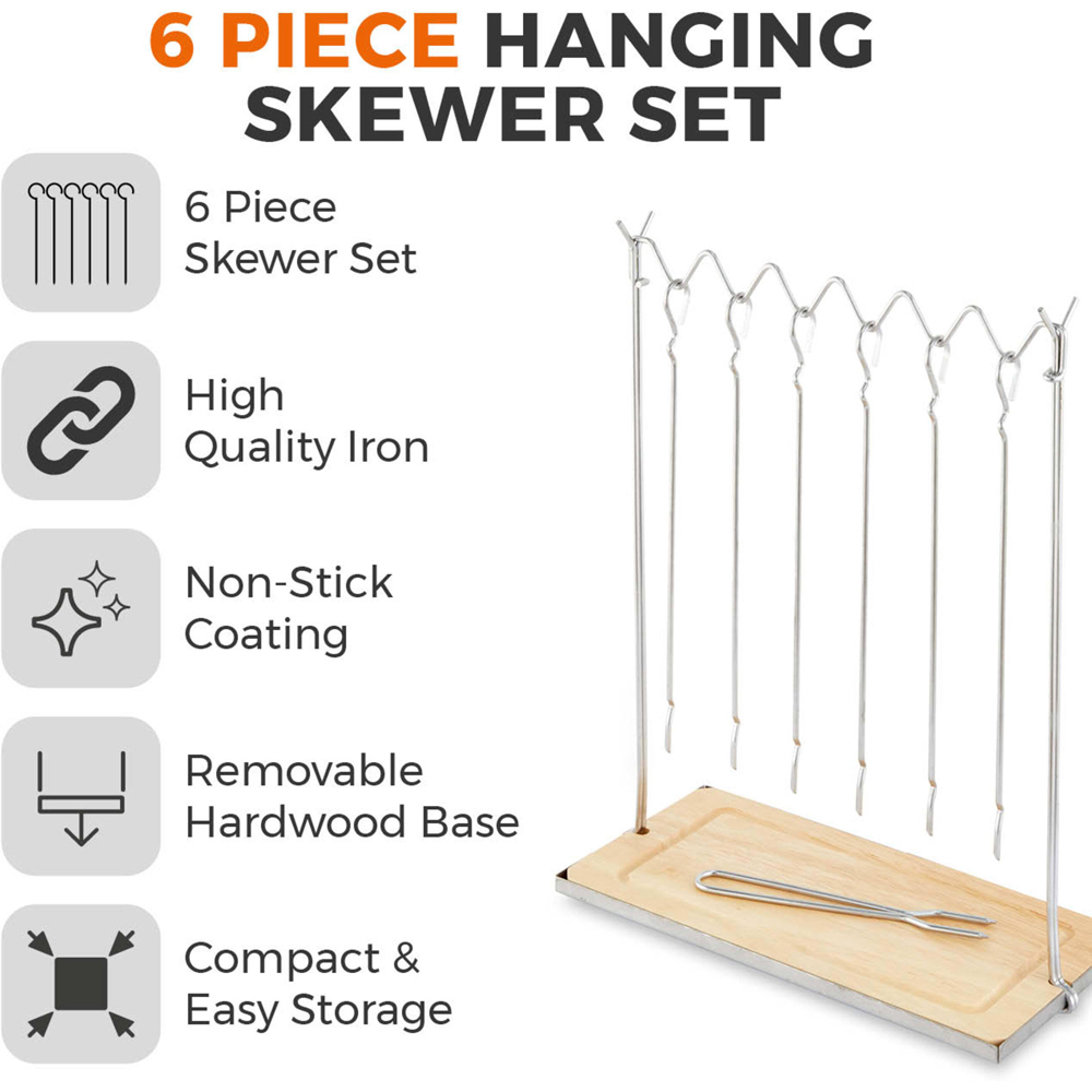 Serve deliciously grilled meat and vegetable skewers straight to the table with the 6 Piece Hanging Skewer Set Stand from Tower. Each skewer is crafted with a non-stick coating that makes it easy to release the food—with the additional help of an included fork—and prevents stuck-on leftover food residue for an even easier clean after use. Includes 6 skewers with individual hanging hooks to hang the skewers from the stand for easy BBQ to table serving, crafted from durable, high-quality iron with sharp edges that slide through food easily. Simply release the food from your skewer onto the removable hardwood base, then remove and serve delicious meats and vegetables straight to your plate. The set also works as a handy chopping board for food prep. The set is collapsible for compact and easy storage, so you can keep it in the drawer or cupboard when not in use.