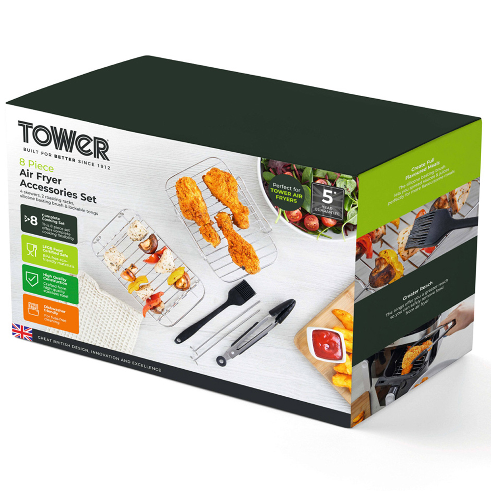 Enhance your cooking experience with the Tower 8-piece accessory set. The set includes four stainless steel skewers, two stainless steel roasting racks, a silicone basting brush, and tongs. The tongs provide extended reach, eliminating the need to directly handle the food in the air fryer. The BPA-free silicone basting brush ensures even distribution of marinades and sauces, resulting in deliciously flavoured meals. The skewers effortlessly pierce through meat and vegetables, making them ideal for family meals. Additionally, the roasting racks allow for the placement of other food items, ensuring even cooking as hot air circulates. All components of this accessory set are dishwasher-safe, making cleaning a breeze.