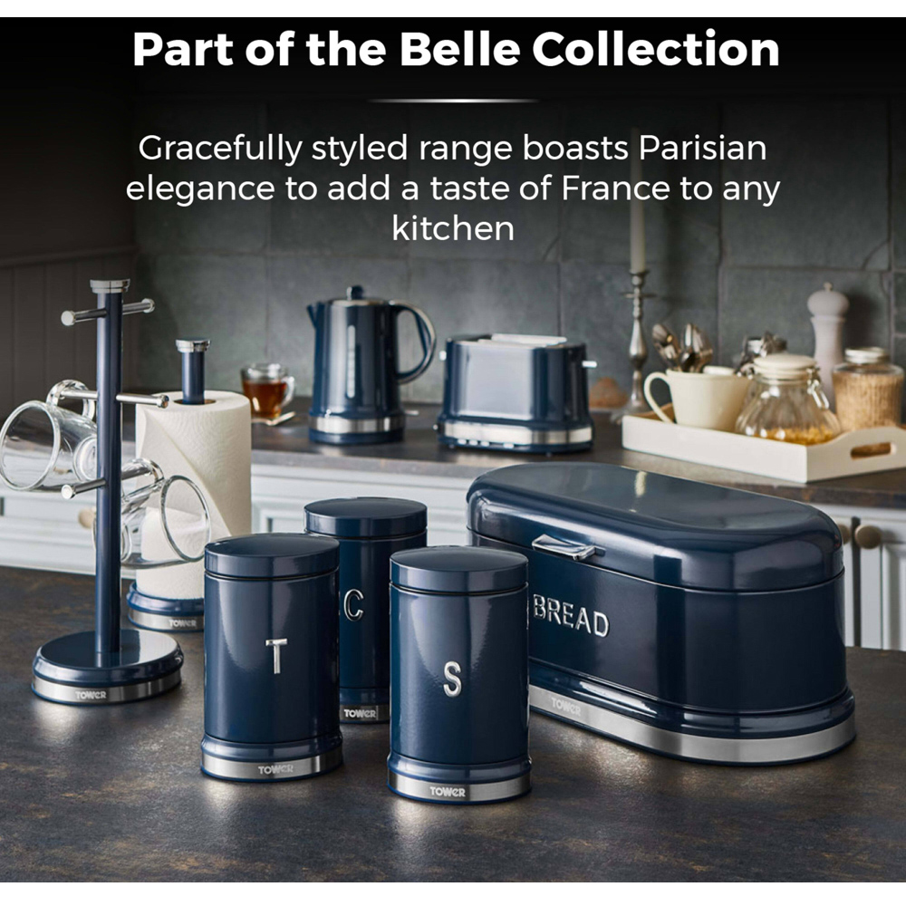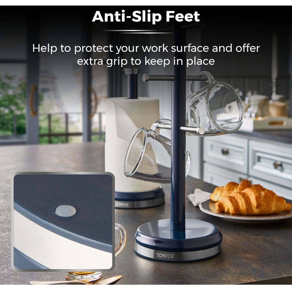 This Tower Belle mug tree and towel pole set provides an elegant storage solution for your cups and kitchen roll. The pair features a co-ordinating Parisian design with bold colourways and stylish chrome highlights to complement your existing kitchen decor. The mug tree's strong stainless steel branches with stoppers at the end offer a secure hold for up to 6 cups at once, allowing you to present your favourite designs neatly beside your kettle. The towel pole is able to comfortably fit any standard-size kitchen roll, keeping your paper towels close-by ready for the next clean-up. A weighted base ensures each accessory stays firmly put on your countertop, while the attached anti-slip feet protect your surfaces against scratching. Built with a durable steel body and chrome effect base ring, both accessories provide a stylish long-lasting finish and can be easily wiped clean to maintain the elegant finish.