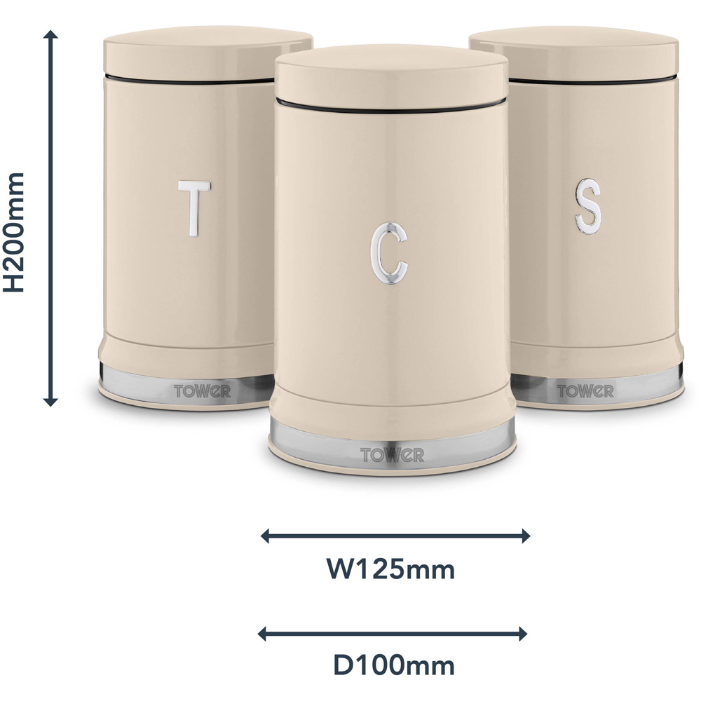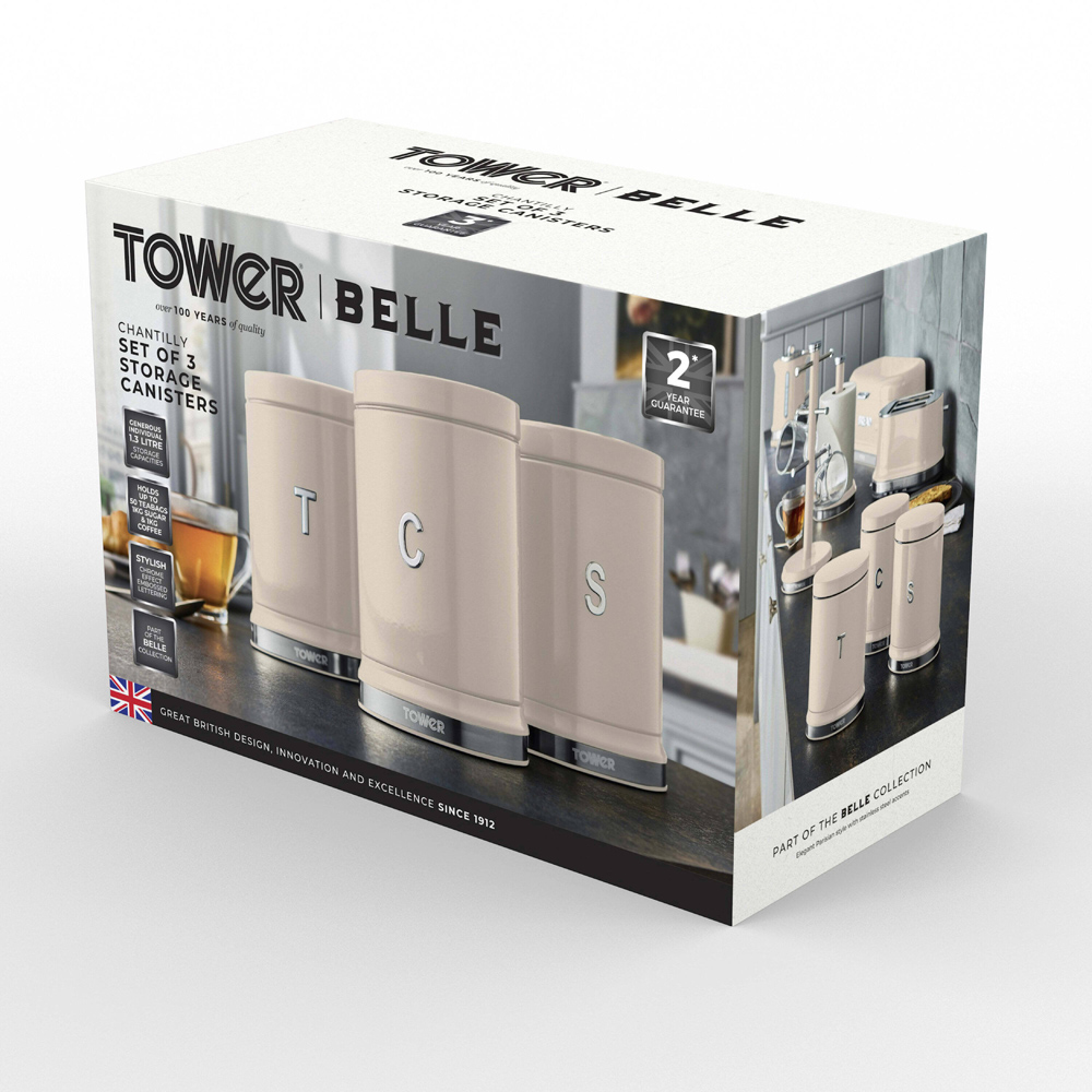 Store your ingredients in style with this Tower Belle Canisters. The set of three containers features a bold colourway wrapped around a sophisticated curved design to bring a touch of elegance to your kitchen. Perfect for storing cuppa essentials, the canisters are decorated with embossed T, C and S chrome lettering, keeping your kitchen neatly organised with an indication of the contents inside. Each canister has a 1.3-litre capacity to store up to 50 teabags, 1kg of coffee and 1kg of sugar neatly on your kitchen countertop, and its small footprint saves space too. The accessible pull lids can easily be removed to empty, refill and access contents as needed, complete with an airtight lid to seal the freshness for longer. Built from durable steel with a chrome effect base ring, these containers are designed to last and can be easily wiped clean to protect the finish. Anti-slip feet keep the canisters in place and prevent scratching against your surfaces.