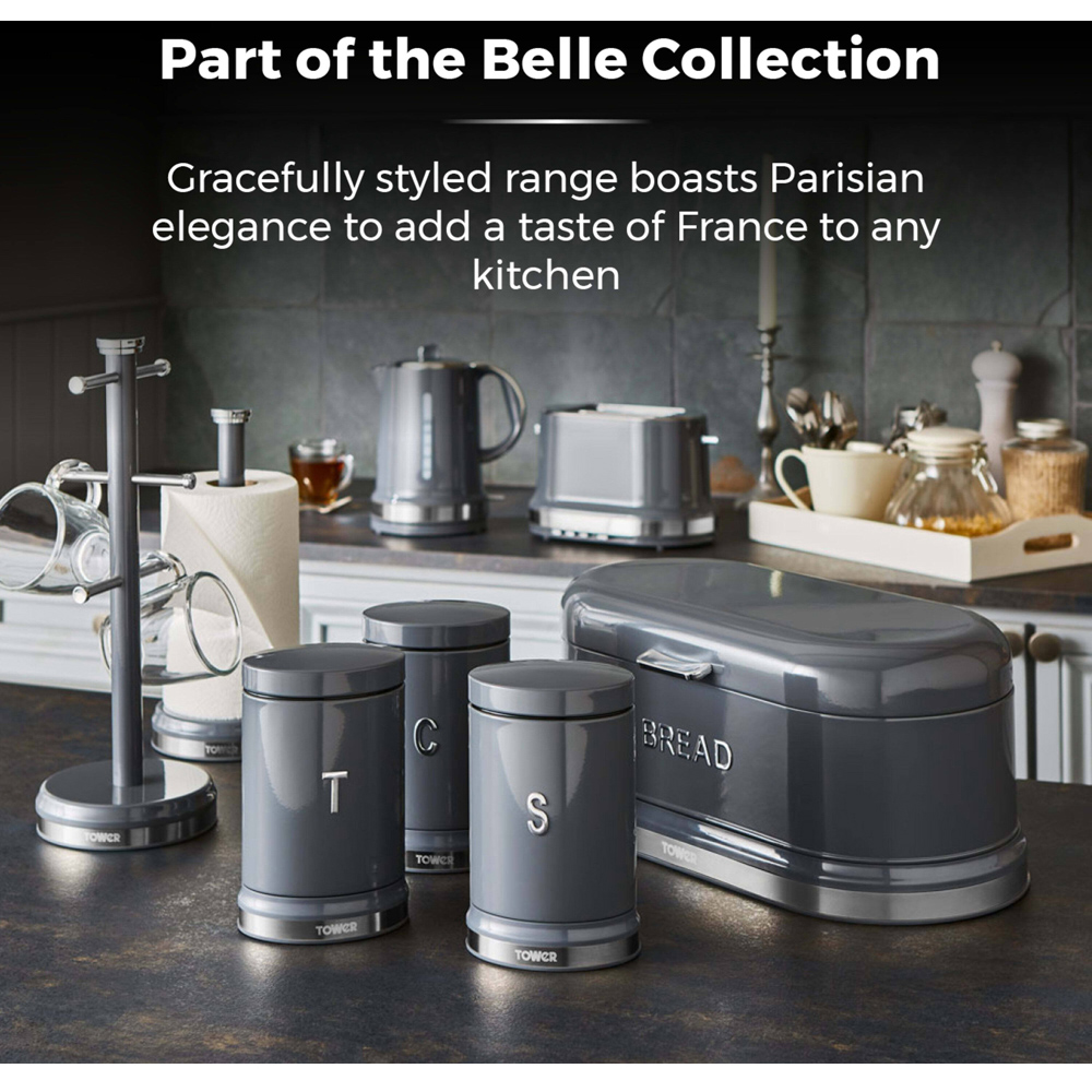 This Tower Belle mug tree and towel pole set provides an elegant storage solution for your cups and kitchen roll. The pair features a co-ordinating Parisian design with bold colourways and stylish chrome highlights to complement your existing kitchen decor. The mug tree's strong stainless steel branches with stoppers at the end offer a secure hold for up to 6 cups at once, allowing you to present your favourite designs neatly beside your kettle. The towel pole is able to comfortably fit any standard-size kitchen roll, keeping your paper towels close-by ready for the next clean-up. A weighted base ensures each accessory stays firmly put on your countertop, while the attached anti-slip feet protect your surfaces against scratching. Built with a durable steel body and chrome effect base ring, both accessories provide a stylish long-lasting finish and can be easily wiped clean to maintain the elegant finish.