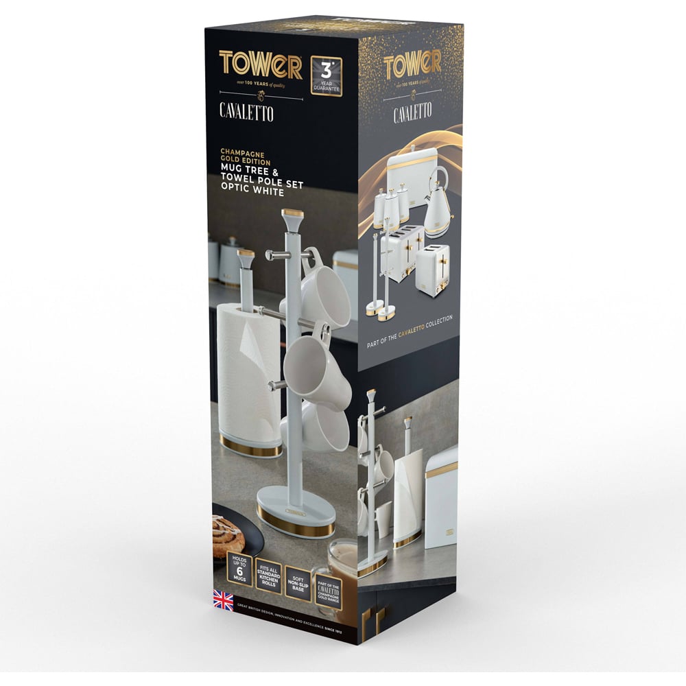 Showcase your favourite mugs and keep kitchen roll within arms-reach with this stylish, contemporary designed Mug Tree and Towel Pole Set from Tower's impressive Cavaletto range. Designed in optic white and champagne gold colours, the mug tree can hold up to 6 mugs of various sizes due to its sturdy stainless steel branches and stoppers. The kitchen roll can comfortably hold any sized kitchen roll. Both feature a weighted base to prevent them from falling over and a non-scratch under liner to prevent your work surfaces from damage. They are also easy to clean, only requiring a simple wipe with a damp cloth to maintain their appearance.