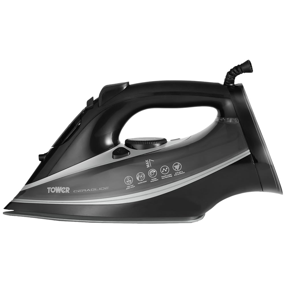 Glide through your ironing pile with the Tower CeraGlide Ultra Speed Iron 3100W in a stylish black and blush pink finish. With a 3100W performance that can be adjusted to varying temperatures for different fabrics, the precision tip soleplate delivers CeraGlide ceramic technology to make quick work of tough creases whilst being gentle on your linens. The variable steam selections offer vertical steam for larger laundry items, a spray and steam and a 40g/minute steam burst so you can tackle all fabrics with minimal effort. Complete with a 360ml water tank this iron is packed with anti-scale, anti-drip and self-cleaning features, removing the need for regular maintenance whilst ensuring a long lifespan.