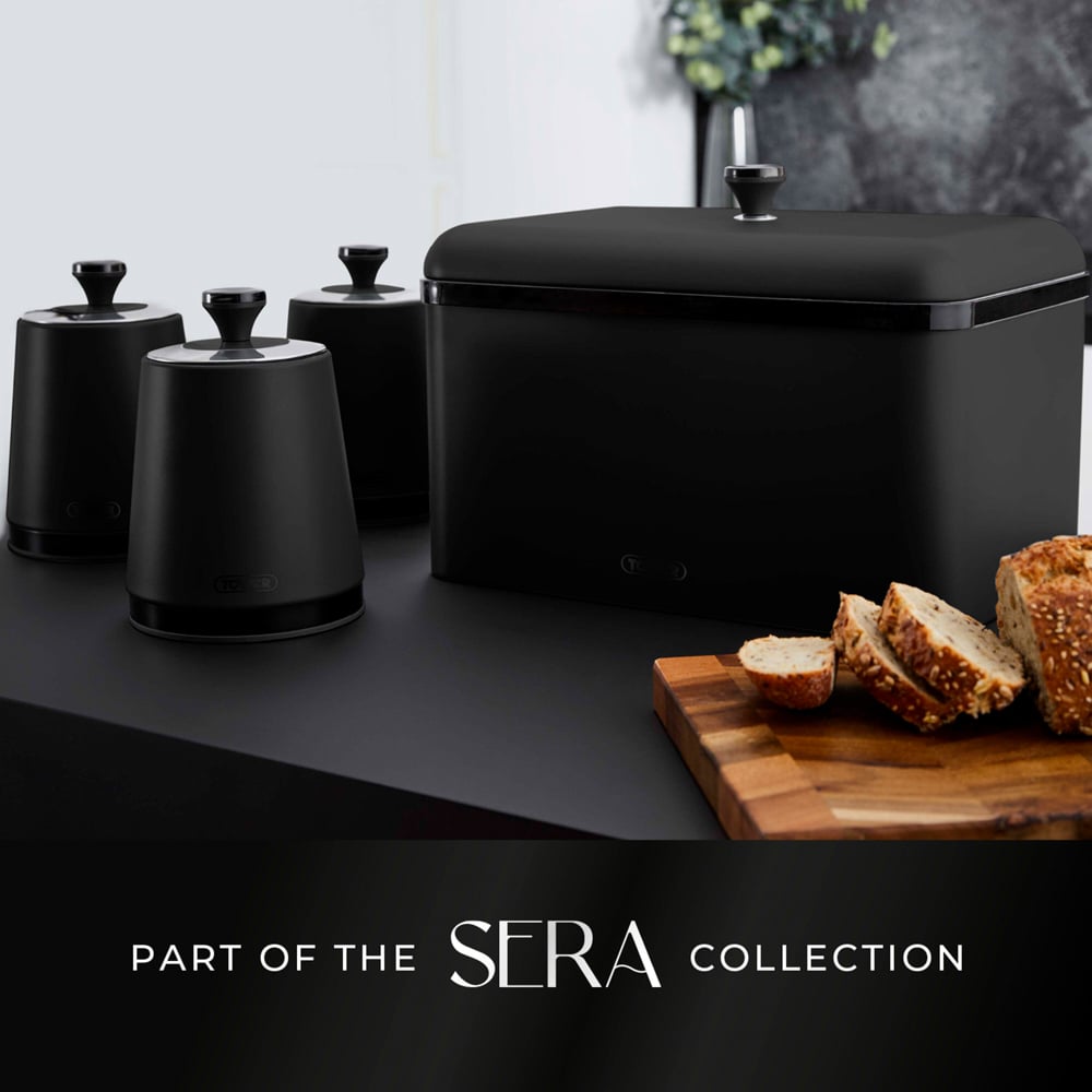 This set of three storage canisters from Sera are perfect for keeping your worktops tidy, whilst they can also be utilised to storage tea, coffee and sugar The stylish matte black finish with smoked black trim adds a sleek feel to any modern kitchen and perfectly complements any contemporary and traditional decor. The lids are fully removable for easy access and completely airtight for long lasting freshness. The compact design and large 1.3L capacity ensures they take up minimal space on the countertop, whilst a simple wipe clean is all that is required to keep the canisters in pristine condition.