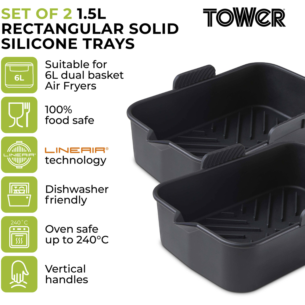 Cook up delicious pizzas, cakes, waffles and more using these Tower Solid Rectangular Silicone Trays, suitable for most Tower 6L dual basket air fryers. Crafted from superior non-stick silicone material for fuss-free cooking and cleaning, enjoy a delicious homemade Victoria sponge, spicy pepperoni pizza or sweet cinnamon waffle. The ribbed interior on the base of the trays collects fat and oil to provide better air circulation and allow food to be heated evenly. Safely lift the trays from basket to plate using the side handles, whilst the sturdy silicone trays stay in shape, ensuring none of the contents spill over whilst handling. The reusable trays are an eco-friendly alternative to single-use parchment liners which are made from 100% food-safe silicone and are odourless and non-toxic. They have an LFGB certification and are guaranteed to be BPA-free.