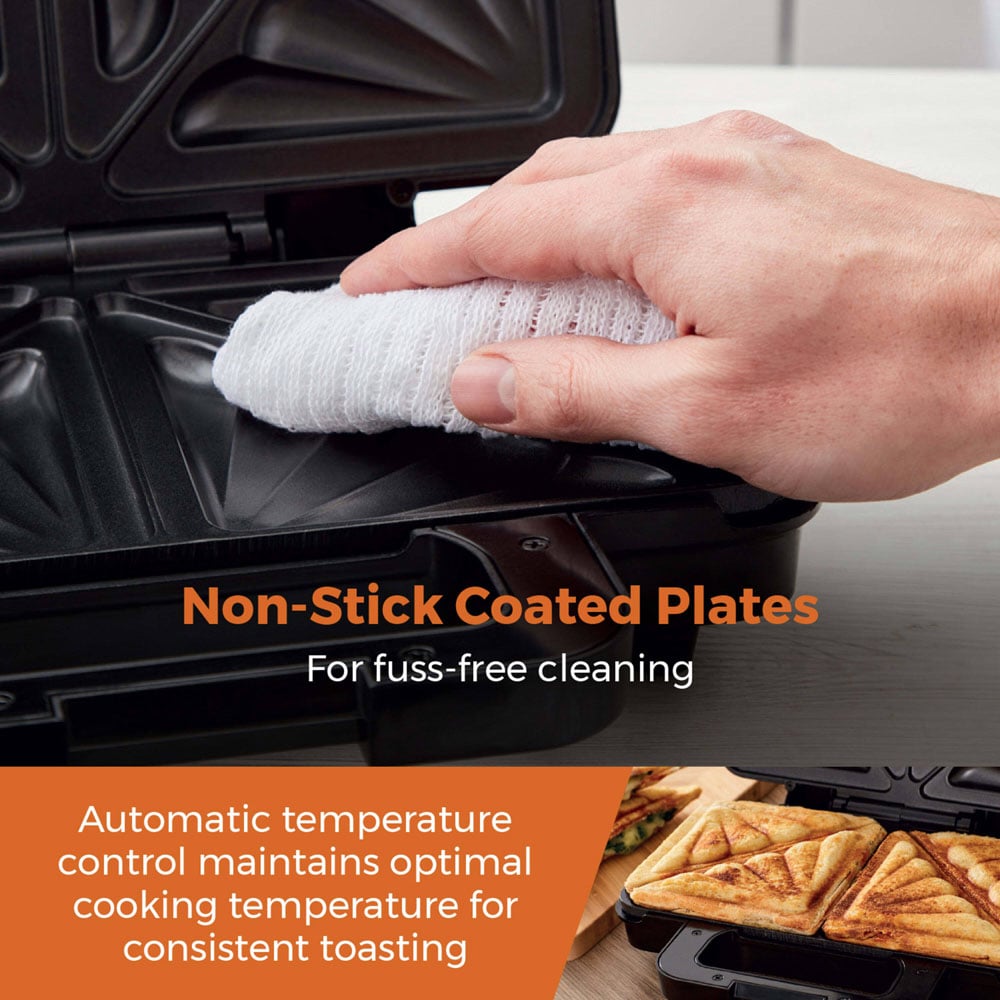 Creating delicious flavourful sandwiches in minutes without the need to flip. The non-stick ceramic plates are deep, letting you fill your sandwich with more ingredients, while also removing the need for oil or butter to create a healthier snack.