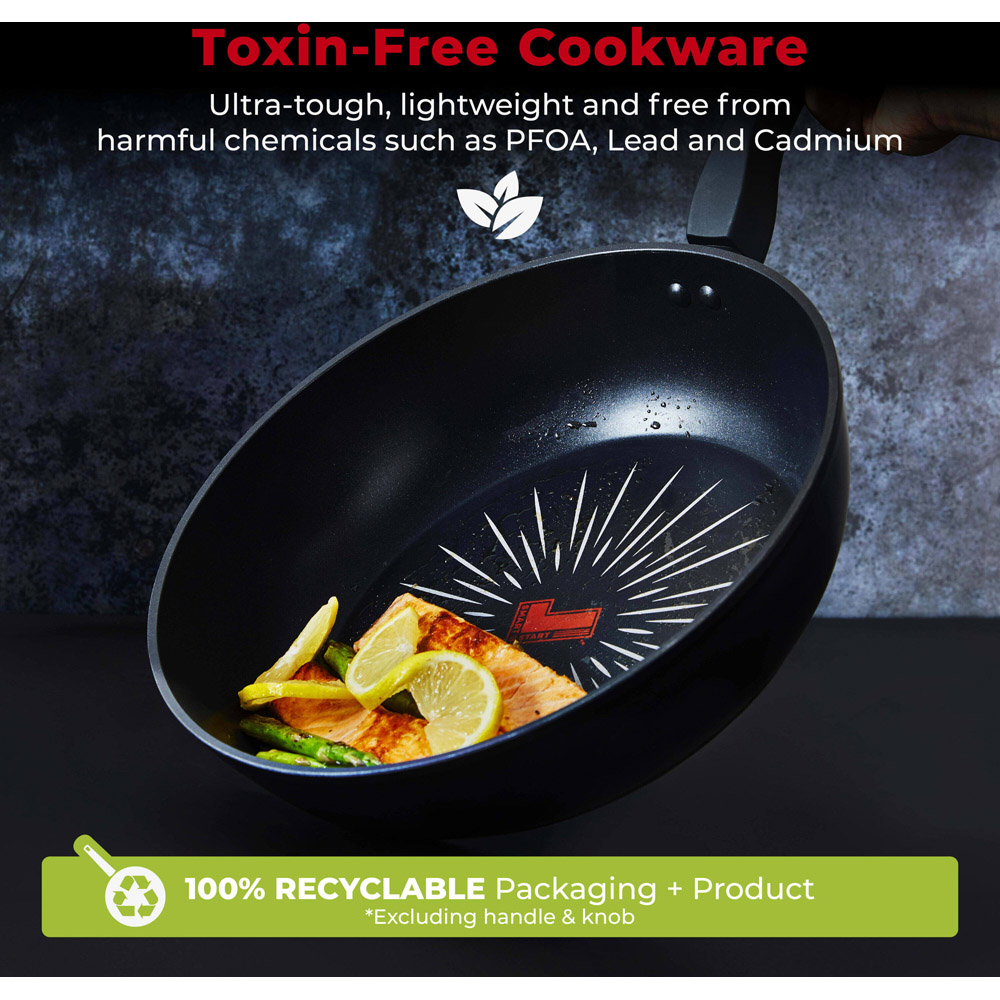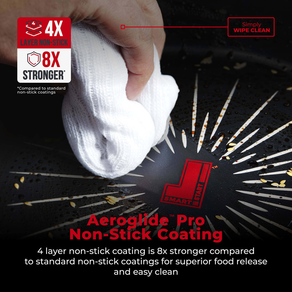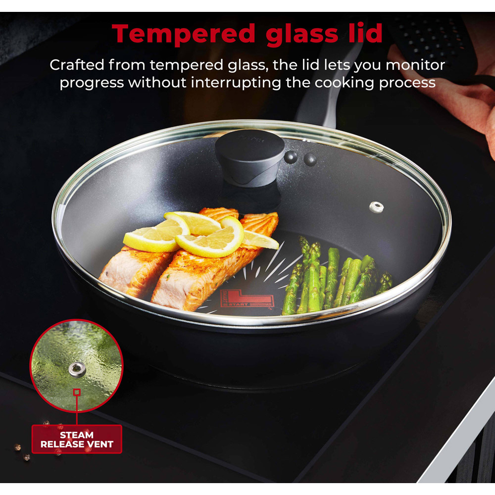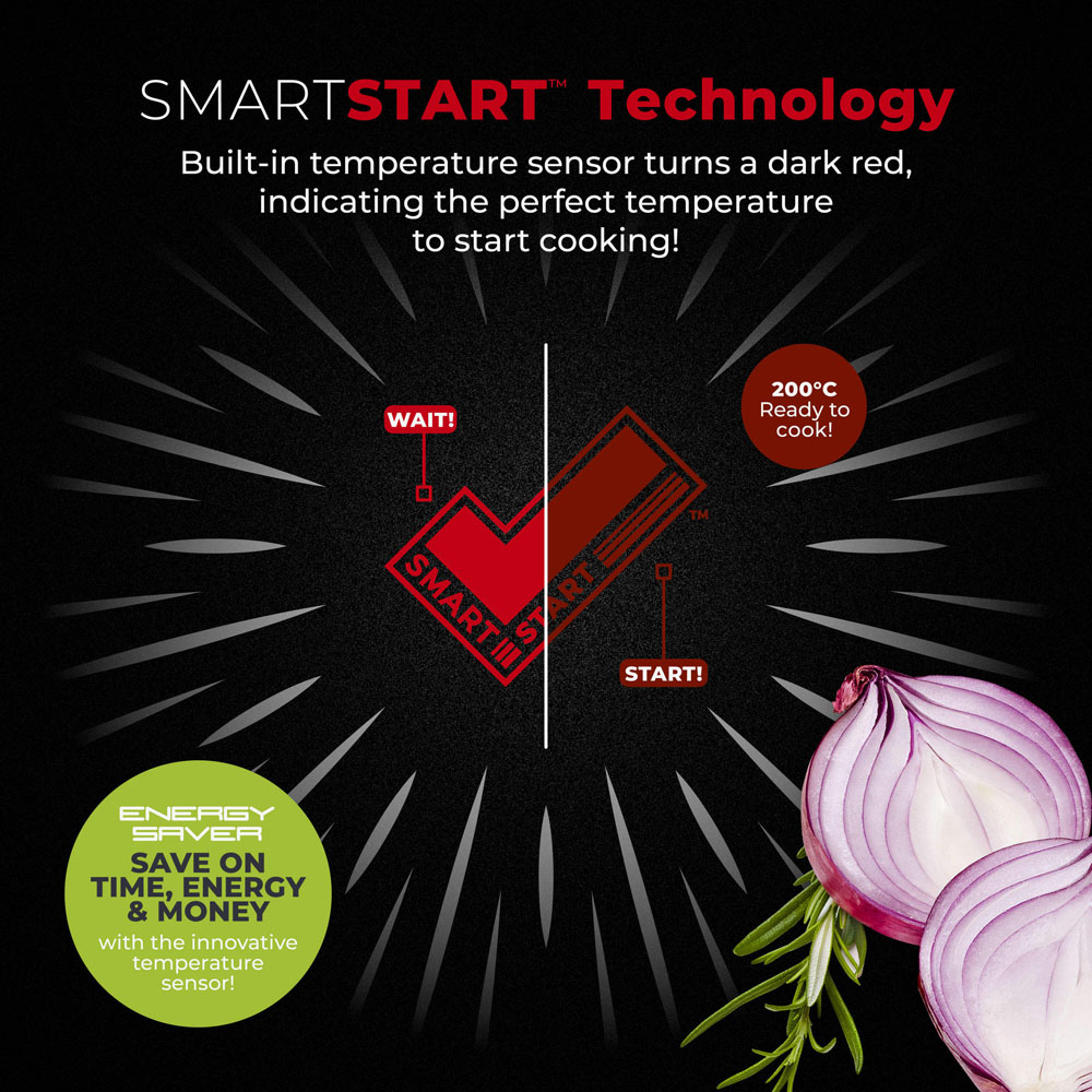 Prepare succulent and delicious meals with the Tower Smart Start Forged Aluminium Multi Pan. This pan has been crafted using 3.5mm forged aluminium with great heat conductivity properties and a lightweight design that ensures rapid heat-up and easy manoeuvrability. The innovative Aeroglide non-stick coating has a base layer with durable abrasion layers and the four-layer coating is eight times stronger than standard non-stick coatings. This frying pan has a bonded steel induction-ready base with an ergonomic softtex handle offering a comfortable grip while cooking. The pan is oven-safe up to 170 degrees Celsius for 40 minutes which enables you to cook different recipes. This 28cm pan features innovative SmartStart technology with a built-in temperature sensor that activates at 150 degrees Celsius. Put the pan onto the heat, wait for the SmartStart tick to change to dark red at 200 degrees Celsius and start cooking. All SmartStart pans are free from harmful chemicals such as PFOA, lead and cadmium. Sustainable materials have been used with fully recyclable products and packaging. This pan is suitable for all hob types and induction hobs as well, it is dishwasher friendly but hand-wash is recommended.