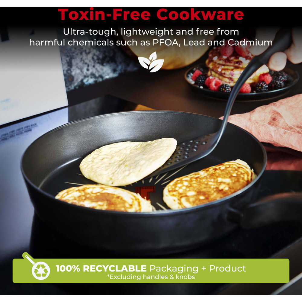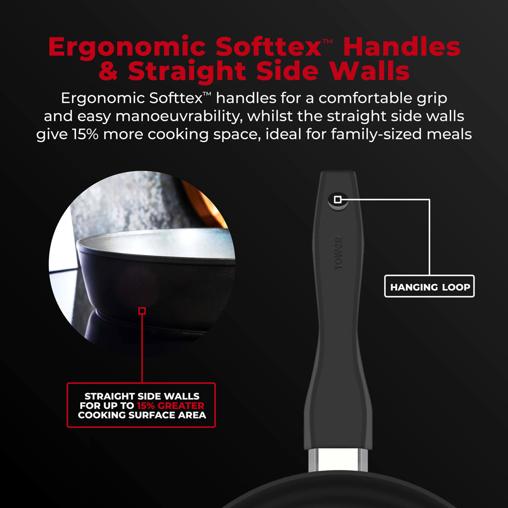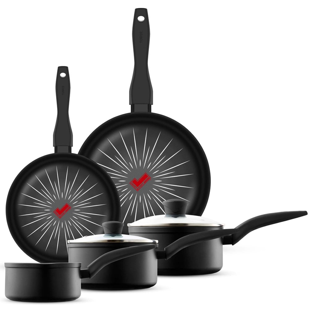 Prepare your favourite dishes with the Tower Smart Start Forged 5-Piece Cookware Set. This five-piece set has been crafted using 3.5mm forged aluminium with great heat conductivity properties and a lightweight design that ensures rapid heat-up and easy manoeuvrability. The innovative Aeroglide non-stick coating has a base layer with durable abrasion layers and the four-layer coating is eight times stronger than standard non-stick coatings. Each pan has a bonded steel induction-ready base with an ergonomic softtex handle offering a comfortable grip while cooking. The Aeroglide coating provides superior food release, it is easy to clean and dishwasher safe as well. This set is oven-safe up to 170 degrees Celsius for 40 minutes which enables you to cook different recipes. This set features innovative SmartStart technology with a built-in temperature sensor that activates at 150 degrees Celsius. Put the pans onto the heat, wait for the SmartStart tick to change to dark red at 200 degrees Celsius and start cooking. It is free from harmful chemicals such as PFOA, lead and cadmium. Sustainable materials have been used with fully recyclable products and packaging. This set is suitable for all hob types and induction hobs as well, it is dishwasher friendly but hand-wash is recommended. This set includes a 20cm frying pan, a 24cm frying pan, a 16cm milk pan, an 18cm saucepan and a 20cm saucepan.