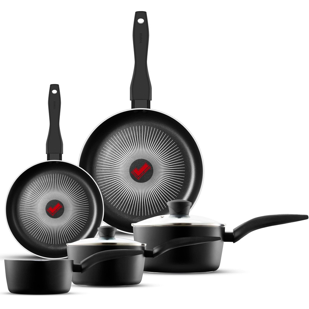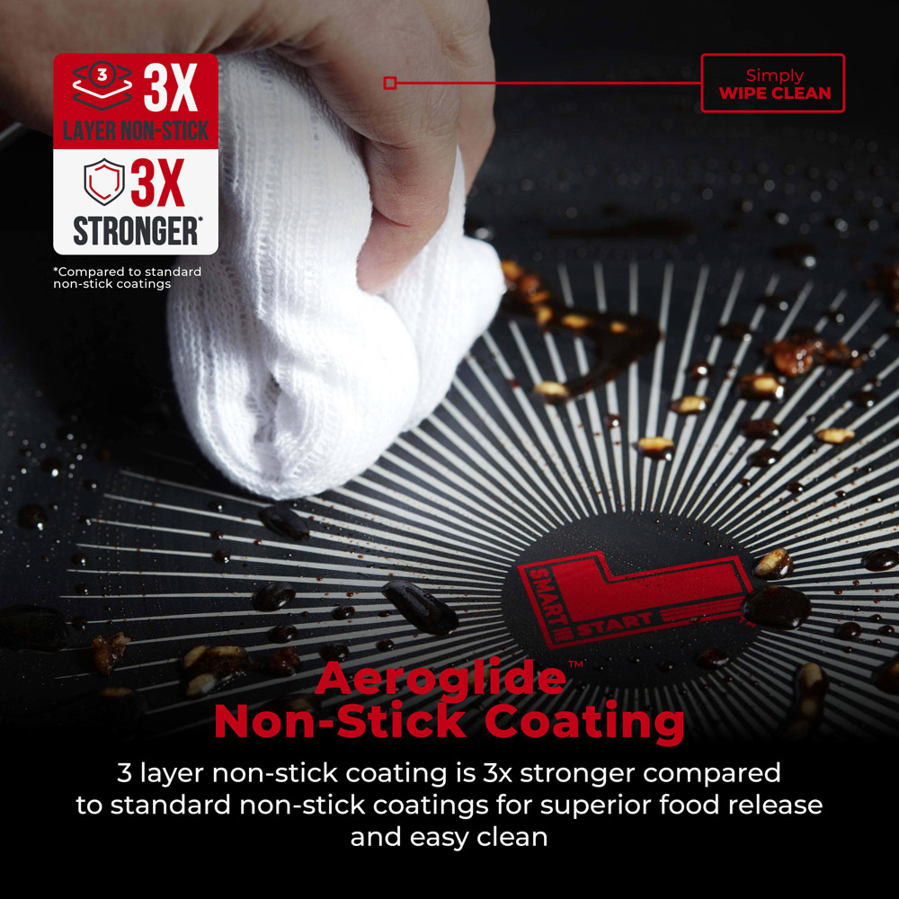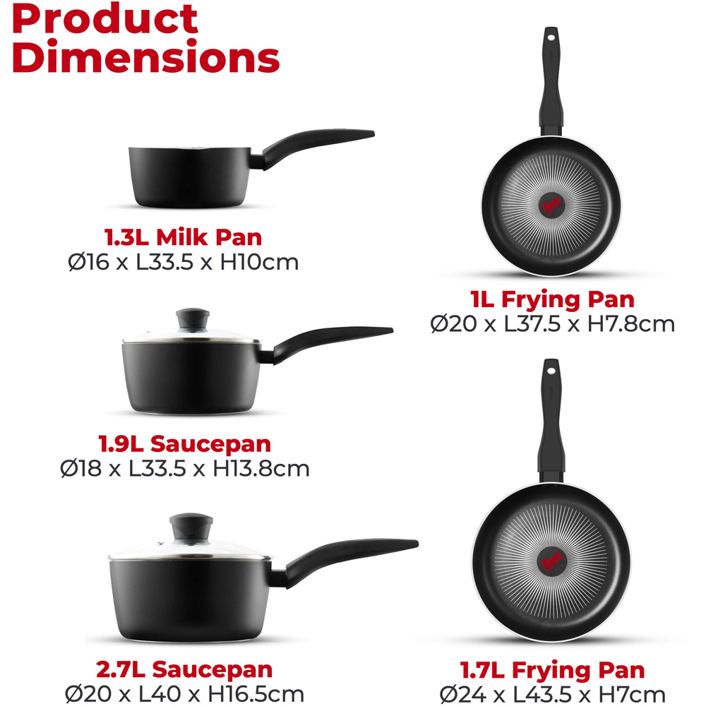 Prepare your favourite dishes with the Tower Smart Start Gourmet 5-Piece Cookware Set. This five-piece set has been crafted using 3mm thick aluminium with great heat conductivity properties and a lightweight design that ensures rapid heat-up and easy manoeuvrability. It features straight side walls that provide 15% more cooking space, ideal for family-sized meals. The innovative Aeroglide non-stick coating has a base layer with durable abrasion layers and the three-layer coating is stronger than standard non-stick coatings. The Aeroglide coating provides superior food release, it is easy to clean and dishwasher safe as well. This set is oven-safe up to 170 degrees Celsius for 40 minutes which enables you to cook different recipes. This set features innovative SmartStart technology with a built-in temperature sensor that activates at 150 degrees Celsius. Put the pans onto the heat, wait for the SmartStart tick to change to dark red and start cooking. It is free from harmful chemicals such as PFOA, lead and cadmium. Sustainable materials have been used with fully recyclable products and packaging. This set is suitable for all hob types and induction, it is dishwasher friendly but hand-wash is recommended. This set includes a 20cm frying pan, a 24cm frying pan, a 16cm milk pan, an 18cm saucepan and a 20cm saucepan.