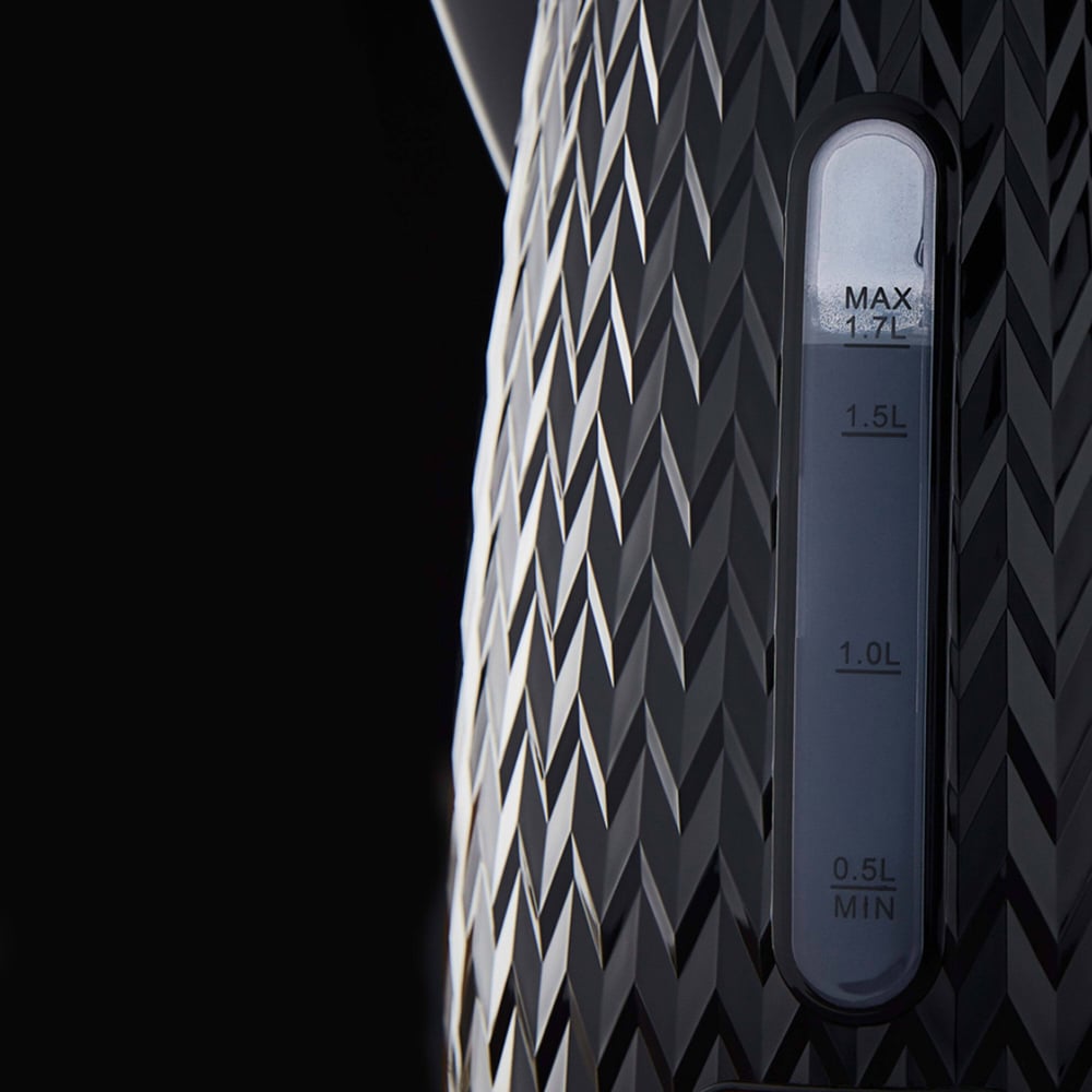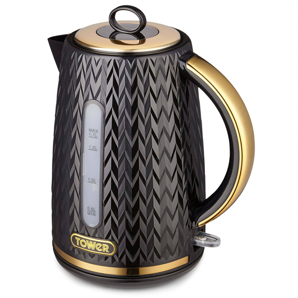 Housed within a textured black coating with bronze accents, this 3kW kettle from Tower brews hot beverages more efficiently, thanks to its rapid boiling system. Its striking empire-patterned design across the body is presented in a sleek black coating with bronze features for an eye-catching piece within the kitchen. The 1.7L capacity makes up to seven cups from a single fill, with a water level indicator window to let you view the contents remaining inside. Set on a 360-degree base, this kettle presents an easy pull-up lid for easy refilling and a removable filter for maintaining between uses. The automatic shut-off and boil dry protection features ensure added safety and peace of mind.