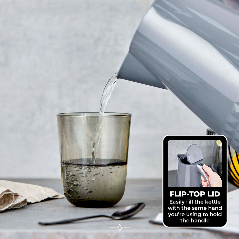 Make the perfect cuppa with this Tower Solitaire 3KW Grey Chrome Accents Kettle. Featuring impressive rapid boil technology, the kettle boils a cup of water in just under a minute, quenching your caffeine needs quickly. The 360-degree swivel base makes it suitable for both left and right-handed users, while its perfect pour spout prevents any spillages. Use the flip-top lid - fill up the kettle with ease after checking the water level using the water level indicator window. Complete with a removable and washable filter and boil-dry protection - it automatically switches the heating element off if there's no water inside. With 1.5 litres capacity - the kettle allows you to brew up to six cups from a single fill, making it perfect for entertaining family and friends. Model no: T10075GRY.