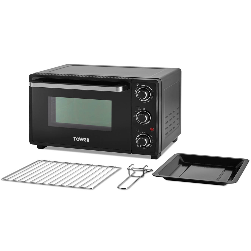 Create a wide range of delicious meals for your loved ones with Tower Black 23-litre Mini Oven. A perfect solution for smaller kitchens or student accommodation - you can roast, bake, grill, toast and even cake with a few turns of the easy-to-use dials. The 90-minute timer and an adjustable thermostat offer temperatures between 90 to 230 degree Celsius. With 3 easy to use dials on the front - you can have total control over your cooking. It comes with a few accessories, including a baking tray, wire rack and tray handle.