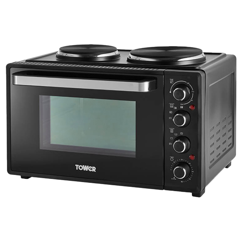 Create a wide range of delicious meals for your loved ones with Tower 32L Mini Oven with Hot Plates. A perfect solution for smaller kitchens or student accommodation - you can roast, bake, grill, toast and even cake with a few turns of the easy-to-use dials. Dual hot plates let you cook soups, casseroles and fried foods for added versatility. The 90-minute timer and an adjustable thermostat offer temperatures between 90 to 230 degree Celsius. With four easy-to-use dials on the front - you can have total control over your cooking. It comes with a few accessories, including a baking tray, wire rack and tray handle.