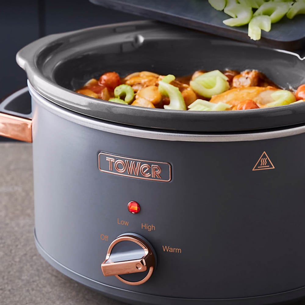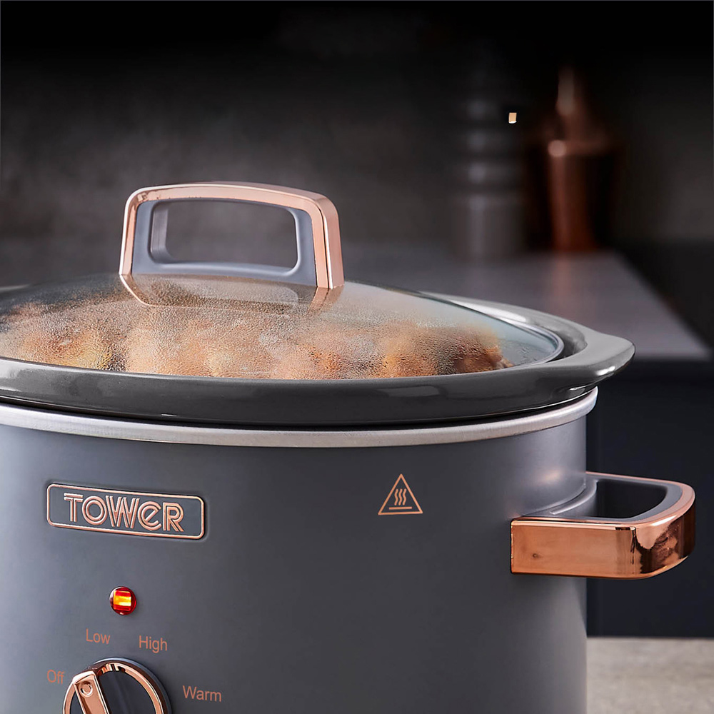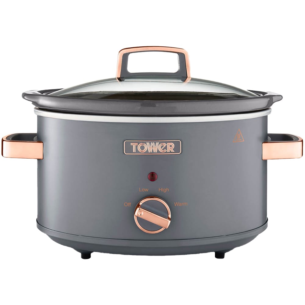 Serve up a delicious feast for your friends and family with Tower Cavaletto 3.5L Slow Cooker. A one-stop-pot for cooking all of your curries, soups and casseroles, this stainless steel slow cooker makes preparing family meals hassle-free. The simple-to-control dial offers 3 heat options for cooking at low or high temperatures. With a keep-warm function, it ensures your food is ready to serve when you get home from work. Constructed using stainless steel, this slow cooker is highly durable and long-lasting. The cool-touch handles make for safe and comfortable handling while the toughened glass lid gives you a clear view of the cooking process. The removable inner cooking pot is dishwasher safe, making it easier to clean up after use. It also features a signature Cavaletto design, combining grey with subtle rose gold accents to provide a stylish addition to today's contemporary kitchen.