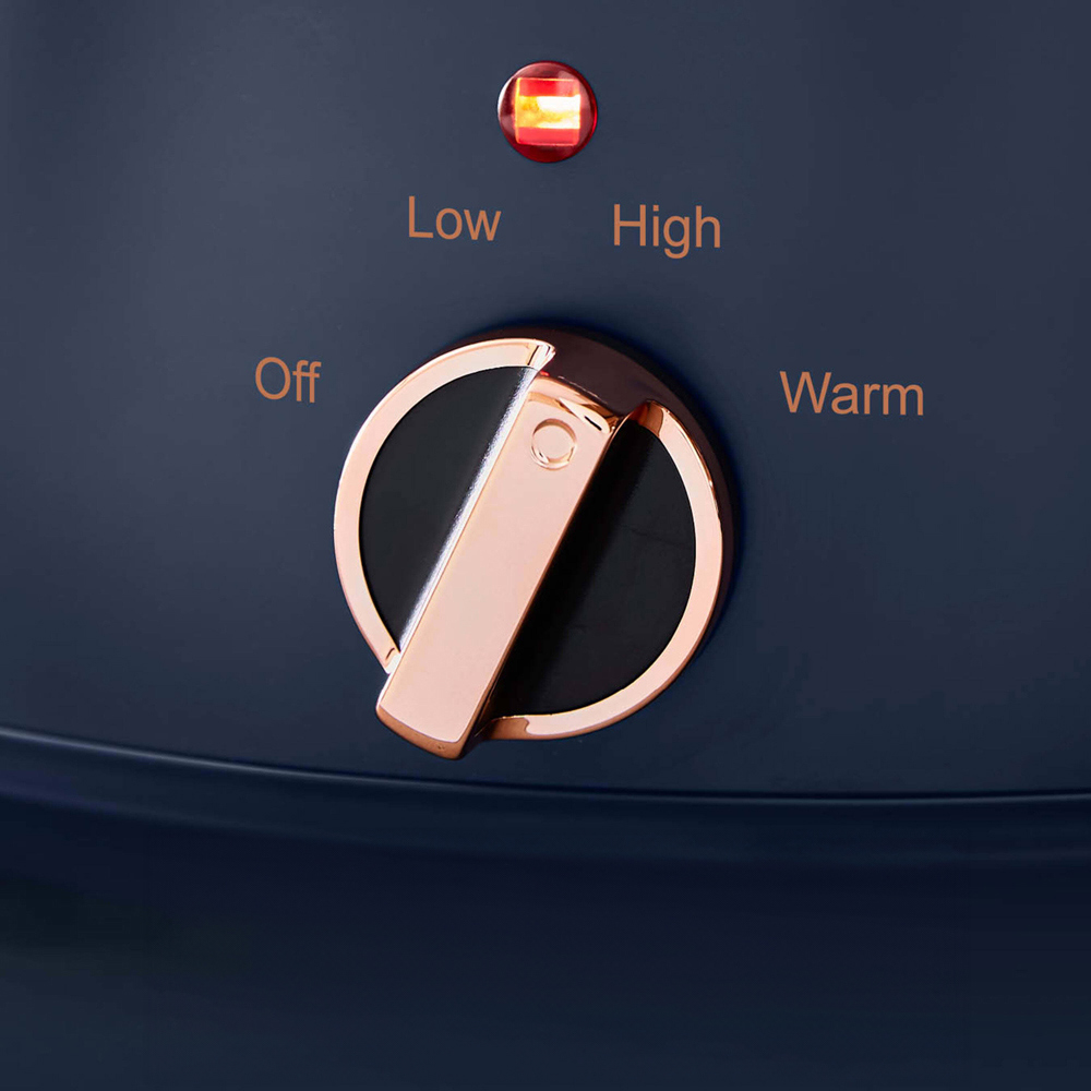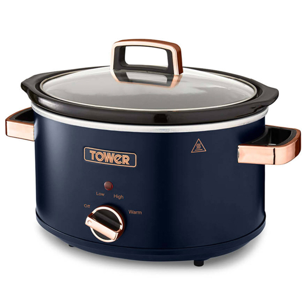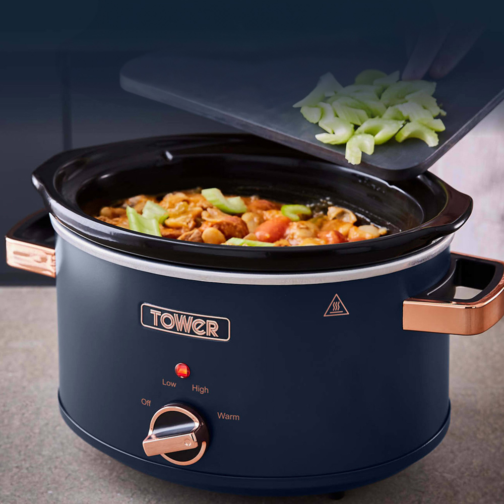 Make deliciously healthy meals for your loved ones with this Tower Cavaletto 3.5L Blue Slow Cooker. There are three different heat settings to choose from - low, high and keep warm. You can cook a range of dishes, including casseroles, soups, stews, curries and even bread, all ready when you get home in the evening. It also features a large 3.5-litre capacity, letting you serve four to five people, making it perfect for wholesome family mealtimes. The tough glass lid gives you a clear view of the cooking process, so you get perfect cooking results every time. The crockpot is removable, and with the cool-to-touch handles, you can safely serve straight to the table and after use. Simply put it into the dishwasher for easy cleaning. With a signature Cavaletto design - it combines blue with subtle rose gold accents to provide a stylish touch to your kitchen. Model no: T16042MNB.