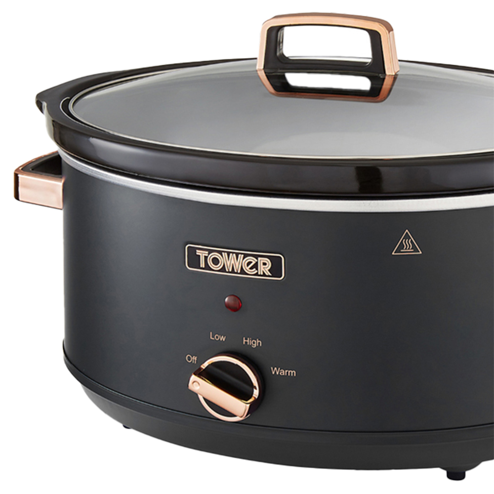 Serve up a delicious feast for your friends and family with Tower Cavaletto 6.5L Slow Cooker. A one-stop-pot for cooking all of your curries, soups and casseroles, this stainless steel slow cooker makes preparing family meals hassle-free. The simple-to-control dial offers 3 heat options for cooking at low or high temperatures. With a keep-warm function, it ensures your food is ready to serve when you get home from work. Constructed using stainless steel, this slow cooker is highly durable and long-lasting. The cool-touch handles make for safe and comfortable handling while the toughened glass lid gives you a clear view of the cooking process. The removable inner cooking pot is dishwasher safe, making it easier to clean up after use. It also features a signature Cavaletto design, combining black with subtle rose gold accents to provide a stylish addition to today's contemporary kitchen.