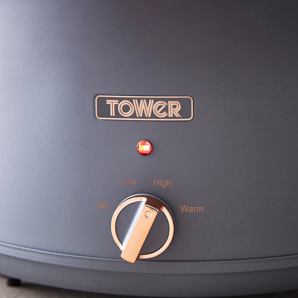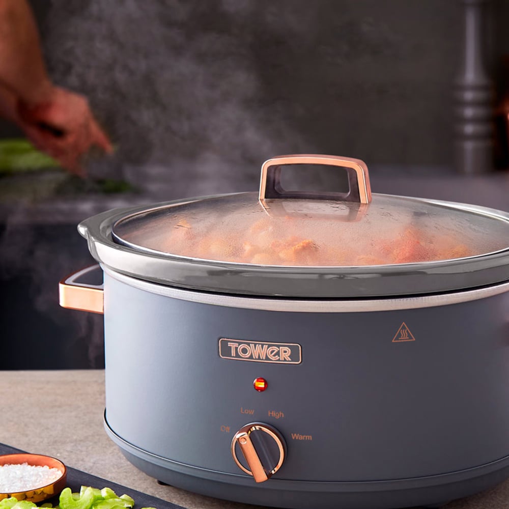 Serve up a delicious feast for your friends and family with Tower Cavaletto 6.5L Slow Cooker. A one-stop-pot for cooking all of your curries, soups and casseroles, this stainless steel slow cooker makes preparing family meals hassle-free. The simple-to-control dial offers 3 heat options for cooking at low or high temperatures. With a keep-warm function, it ensures your food is ready to serve when you get home from work. Constructed using stainless steel, this slow cooker is highly durable and long-lasting. The cool-touch handles make for safe and comfortable handling while the toughened glass lid gives you a clear view of the cooking process. The removable inner cooking pot is dishwasher safe, making it easier to clean up after use. It also features a signature Cavaletto design, combining grey with subtle rose gold accents to provide a stylish addition to today's contemporary kitchen.