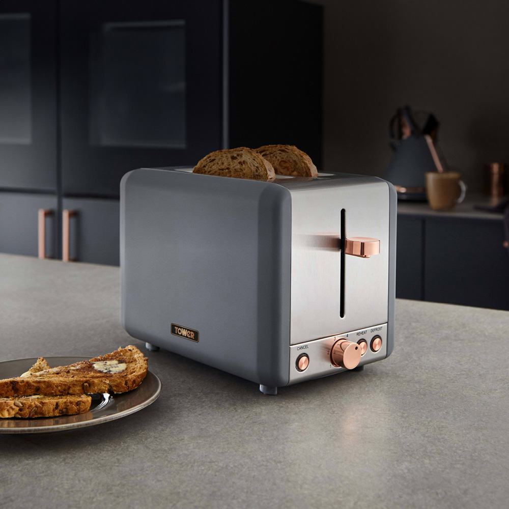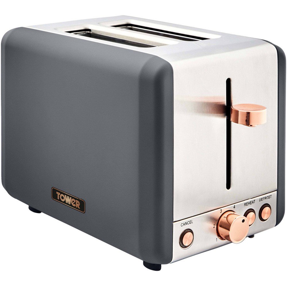 Make a heart-warming breakfast in no time with this Tower Grey Cavaletto Stainless Steel 850W 2 Slice Toaster. Featuring six browning settings – it gives you more control over the toasting time so you can enjoy your toast, crumpets and bagels to suit your taste. It also features defrost and reheat settings that allow you to toast from frozen or reheat cold food back up before serving. The removable crumb tray provides quick and easy cleaning to keep your surfaces neatly presented. Model no: T20036RGG.