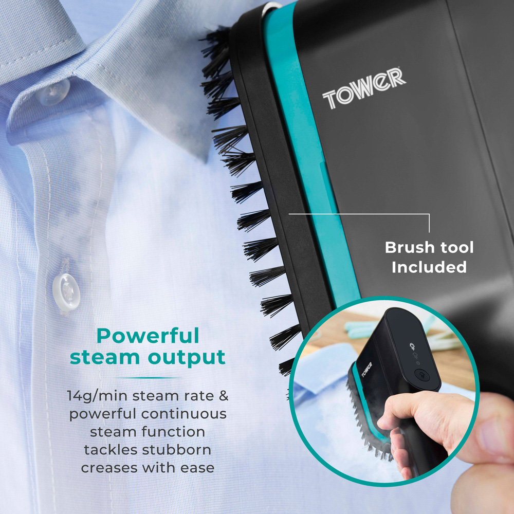 Effortlessly remove creases from your clothes without setting up the ironing board with the Tower Ceraglide Digital Handheld Garment Steamer. Featuring a digital LED display that provides seamless use with 3 indicator lights that show you whether the garment steamer is on, or which steam setting has been selected. The ceramic soleplate evenly distributes heat for a smoother glide across all fabric types. A 1400W output ensures rapid heat up in under 30 seconds so you can make quick work of removing creases from clothes, with a built-in indicator light to let you know when heat up is complete and provides an effective handheld alternative to ironing with a 14g/min steam rate. Make light work of larger fabric using the continuous steam function to quickly eliminate wrinkles and creases from curtains and bedsheets. It features a 1.8m power cord for less restricted movement from the nearest plug socket, whilst a brush head attachment will smooth out fibres for more efficient steaming.