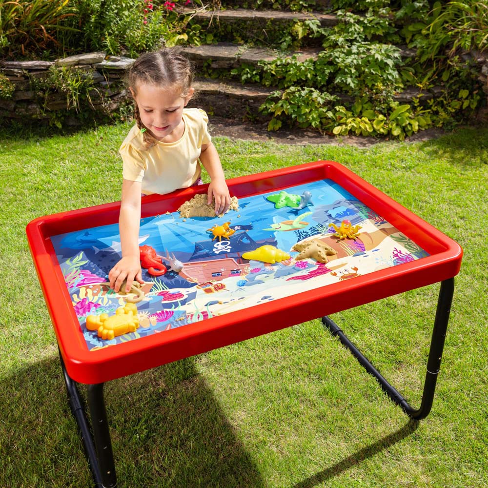 Experience thrilling playtime with Toyrific Sea and Dino Indoor Outdoor Plastic Play Tray Table. With powder-coated adjustable metal legs and easy-lift hand grips, this is easily transported between indoor and outdoor use. It includes rubber feet that provide stability on smooth surfaces and a bobbled underside prevents any scratching on table tops and floors, whilst the rectangular shape makes carrying through standard-sized doors a breeze. The Sea and Dino Set includes 2 vibrant playmats designed with exciting illustrations for endless fun and imaginative play. With the additional magic sand and themed sand moulds, little ones can create their own underwater or prehistoric pals, and the included play figures further enhance the fun. When playtime is over, the themed play mats can be easily wiped clean and stored for next time, and the addition of a pouring spout on the tray makes the removal of water a simple and quick process.