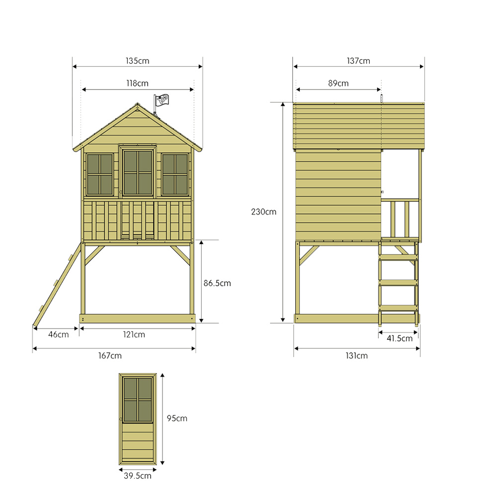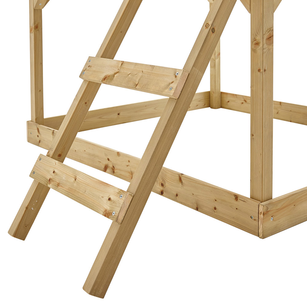 TP Hilltop Wooden Tower Playhouse is raised on a sturdy platform. The playhouse is treated and made from wood panels, which are easy to assemble. The playhouse features two windows and a door. The wooden platform can be accessed with a ladder. The shaded space created by the platform makes for the shaded sandpit area. The sandpit is ideal for sunny gardens and extra play value.