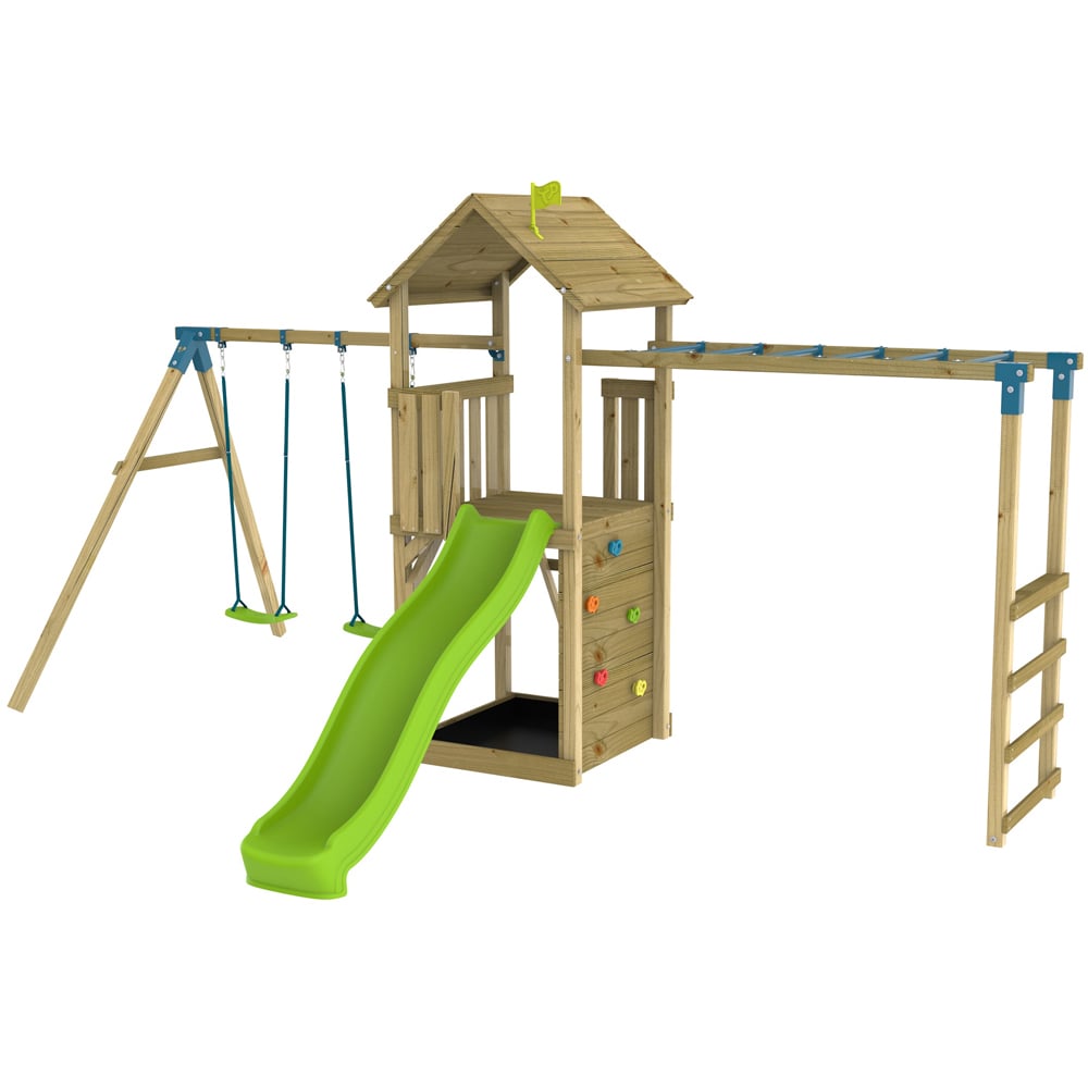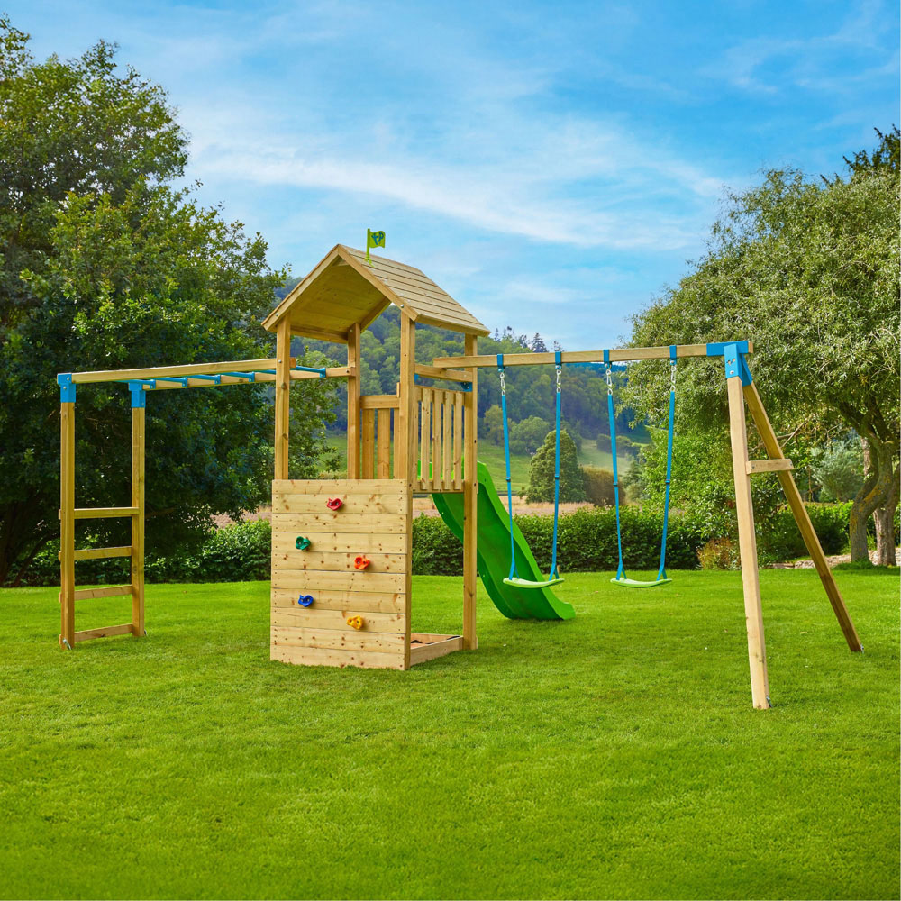 Welcome to playtime bliss with the brand new Skywood Play Range featuring the incredible Skywood Play Tower, 8ft Ripple Slide, Monkey Bars, and a Double Swing Arm with two Rapide Swing Seats. This range is the epicentre of outdoor fun. Crafted from durable, weather-resistant FSC Certified Wood, Skywood is built to withstand the elements and provide years of endless joy.
