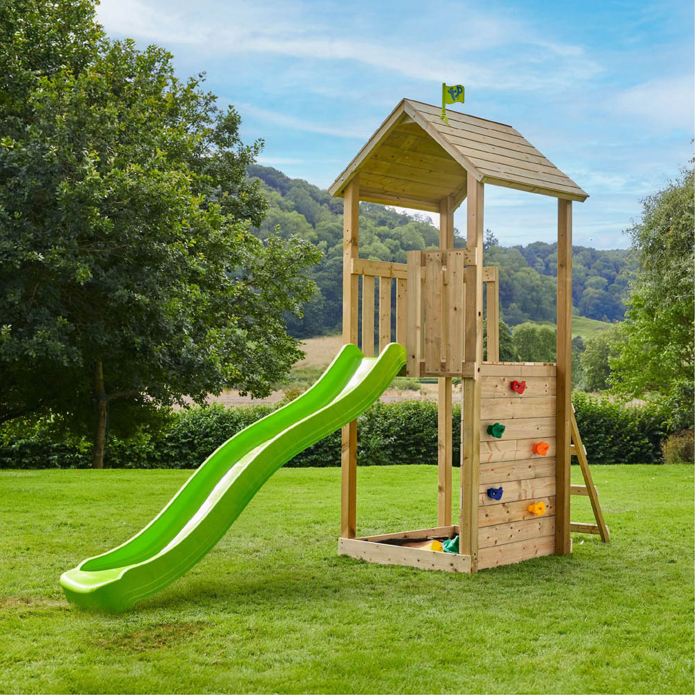 Outdoor playtime just got even better with the brand new Skywood Play Tower from TP Toys, part of the modular Skywood Range. Featuring a 1.2m high platform accessible by ladder or exciting climbing wall and including the 8ft Ripple slide, your little one will enjoy the thrill of playtime. Platform area 86 x 104cm.