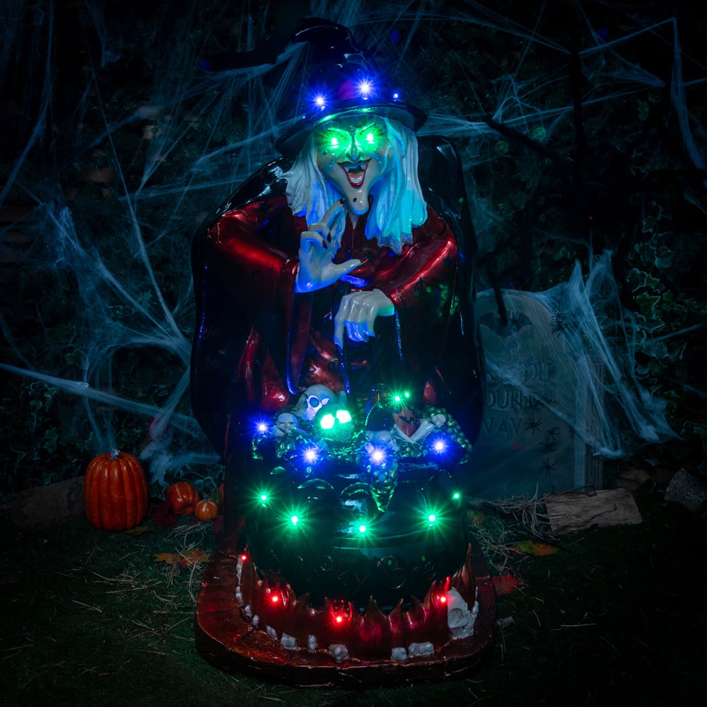 Add a dash of spooky charm to your Halloween with this enchanting Witch and Cauldron Figure! Standing 4ft tall, this eerie yet whimsical piece features a detailed witch stirring her bubbling cauldron! As the motion sensors are triggered, the figure comes to life with haunting sounds—the cackling of the witch and the eerie hiss of her potion. 24 Multicoloured LED lights cast an ominous glow creating the perfect eerie atmosphere. Whether placed in your entryway, living room, or a covered area in the garden, this animated figure is sure to spook and delight guests of all ages. Perfect for any Halloween display, this motion-activated Halloween decoration is a must-have for any haunted house setup. Bring a bit of magical mischief to your celebration this season!