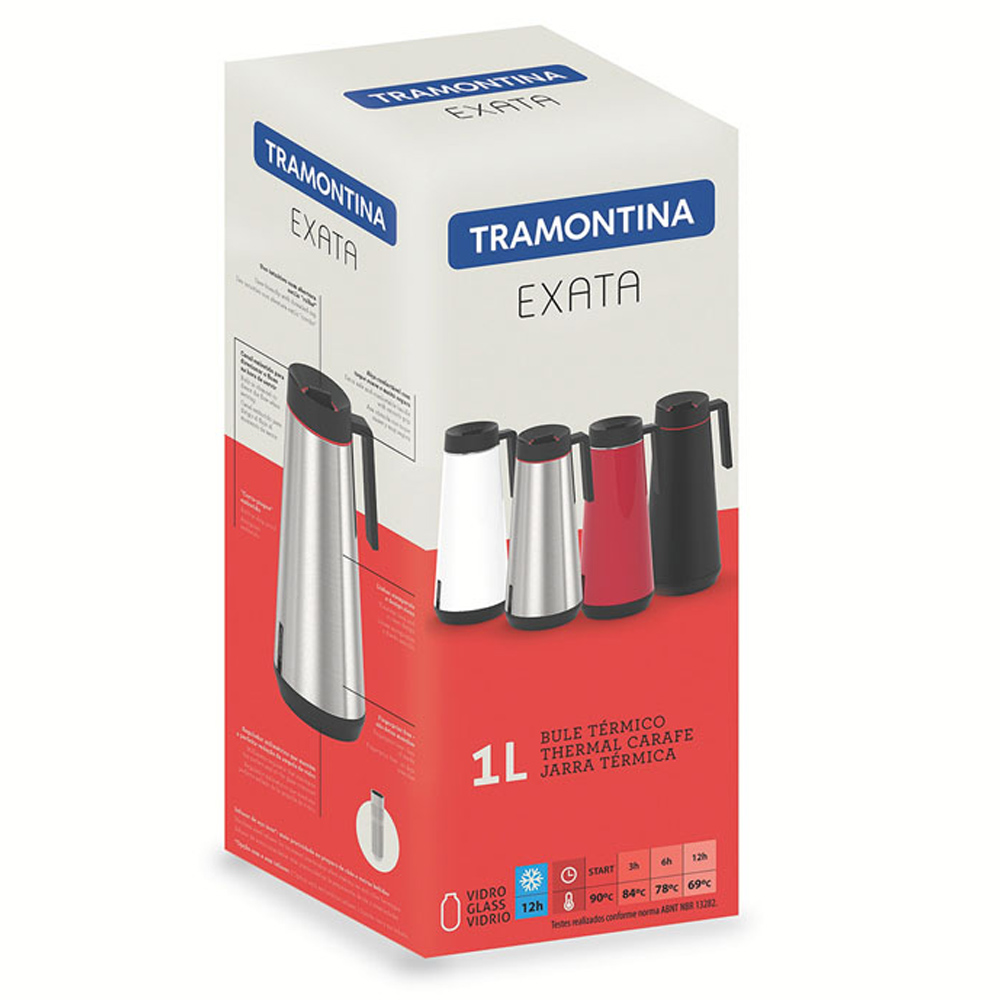 Experience superior temperature retention with the Tramontina Silver Stainless Steel Thermal Flask. This one-litre Exata thermal flask keeps cold drinks cold for up to 9 hours and hot drinks at a perfect drinking temperature for up to 12 hours, so you can enjoy your favourite drink at its best. Featuring an interior glass container, it comes with an easy-to-open screw top lid and an innovative channel that directs the flow of liquid perfectly to ensure a drip-free pour. Also, with clean, timeless lines and a brushed stainless steel fingerprint-proof finish to prevent marks, it has an ergonomic handle for comfort and safety, leaving no surprise as to why it was a winner of the prestigious IF Design Award. This flask can be used in a variety of settings such as in the home or office, as it is also available in 750ml capacity. Plus, there are a variety of options for use, for example, the smaller stainless steel for milk, the larger for tea and the black one for coffee. You can also fill them with water and juices to keep them chilled and easy to serve. Capacity: 1L.