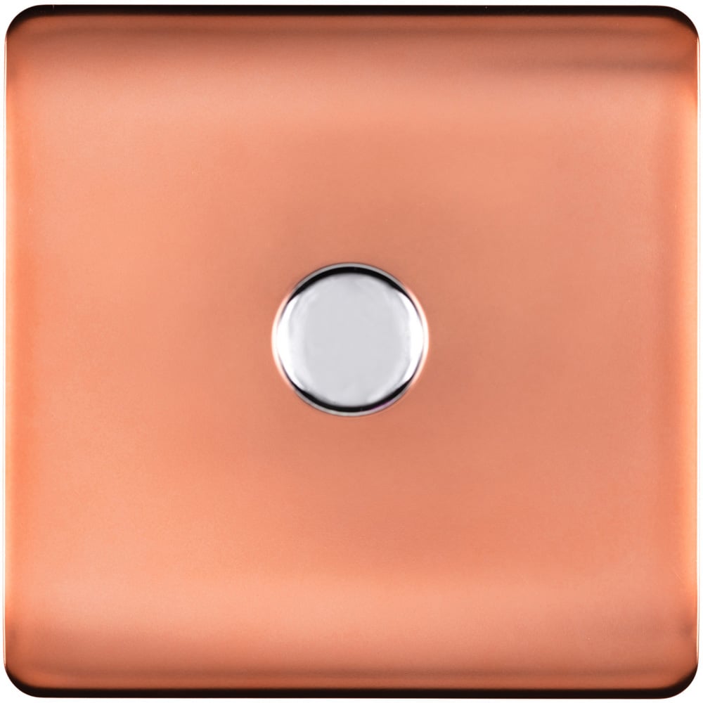 Upgrade your home lighting effortlessly with the Trendi Switch 1 Gang 10amp Copper Rotary LED Dimmer Light Switch. It features sleek 1 gang one or two-way and intermediate 150-watt LED dimmer Rotary Light Switches comprise of a chrome dimming knob on a screwless plate. The design highlights the full colour of the product, supported by a black frame that houses the screw holes and amp module for easy installation into compatible back boxes and wiring. With no additional wiring, the screwless plate is easy to clean and install, you can replace your old switch by removing the face plate and clicking the new one into place.