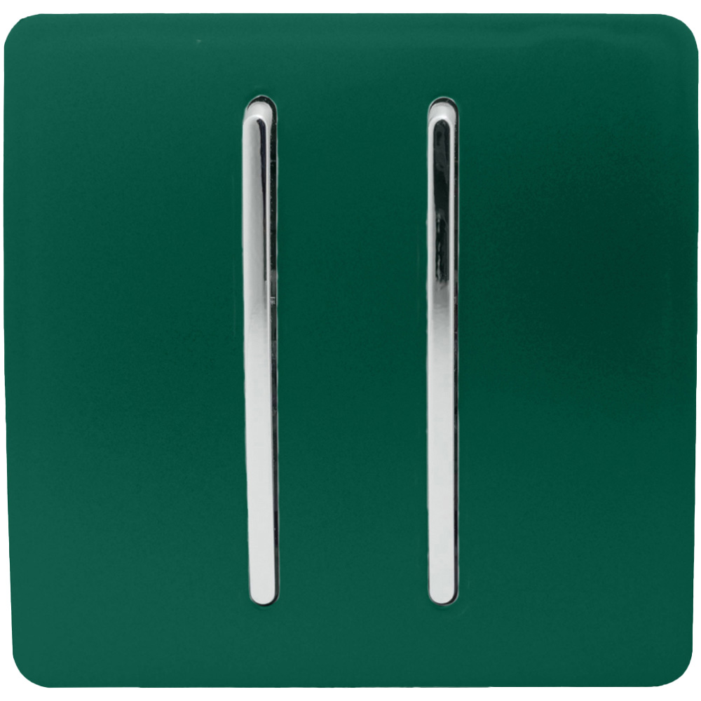 Upgrade your home lighting effortlessly with the Trendi Switch 2 Gang 10amp Dark Forest Green Rocker Light Switch. It features sleek 2 gang one or two-way and intermediate (3-way) rocker Light Switches, boosting a stylish chrome rocker on a screwless plate. The design highlights the full colour of the product, supported by a black frame that houses the screw holes and amp module for easy installation into compatible back boxes and wiring. With no additional wiring, the screwless plate is easy to clean and install, you can replace your old switch by removing the face plate and clicking the new one into place.