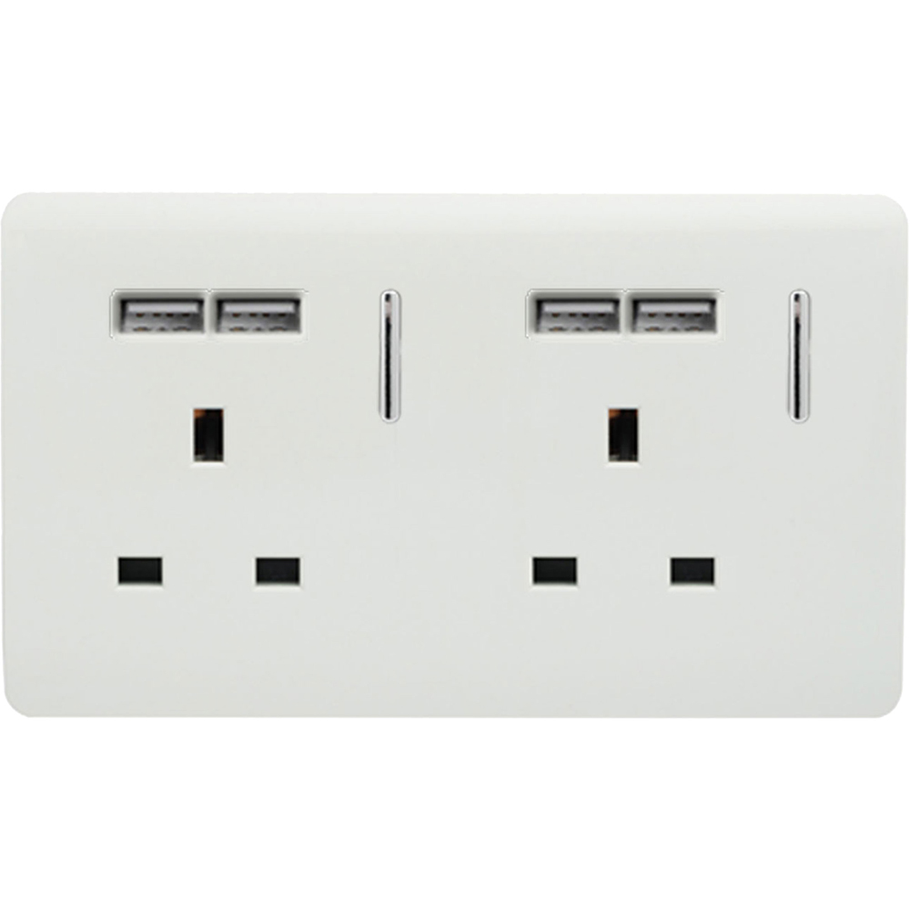 Enhance your home walls with the Trendi Switch 2 Gang 13amp 4 Port USB Ice White Plug Socket. With various colours and features, this plug socket makes your home look cleaner and aesthetic. The two-gang 13amp four port USB plug socket includes a sleek chrome rocker on a screwless plate. This feature displays the complete colour of the products. The socket is supported by a back frame storing the screw holes and amp. The module for the product to be installed is stored away in the compatible back box and wiring. This screwless plate’s modern appearance adds to the decorating breeze. Direct sunlight does not take away the colour of the light switch faceplate. It maintains a smooth, polished surface in matt black. The product is easy to clean and can be simply installed. To replace the old switch, remove the faceplate and click on the new one.
