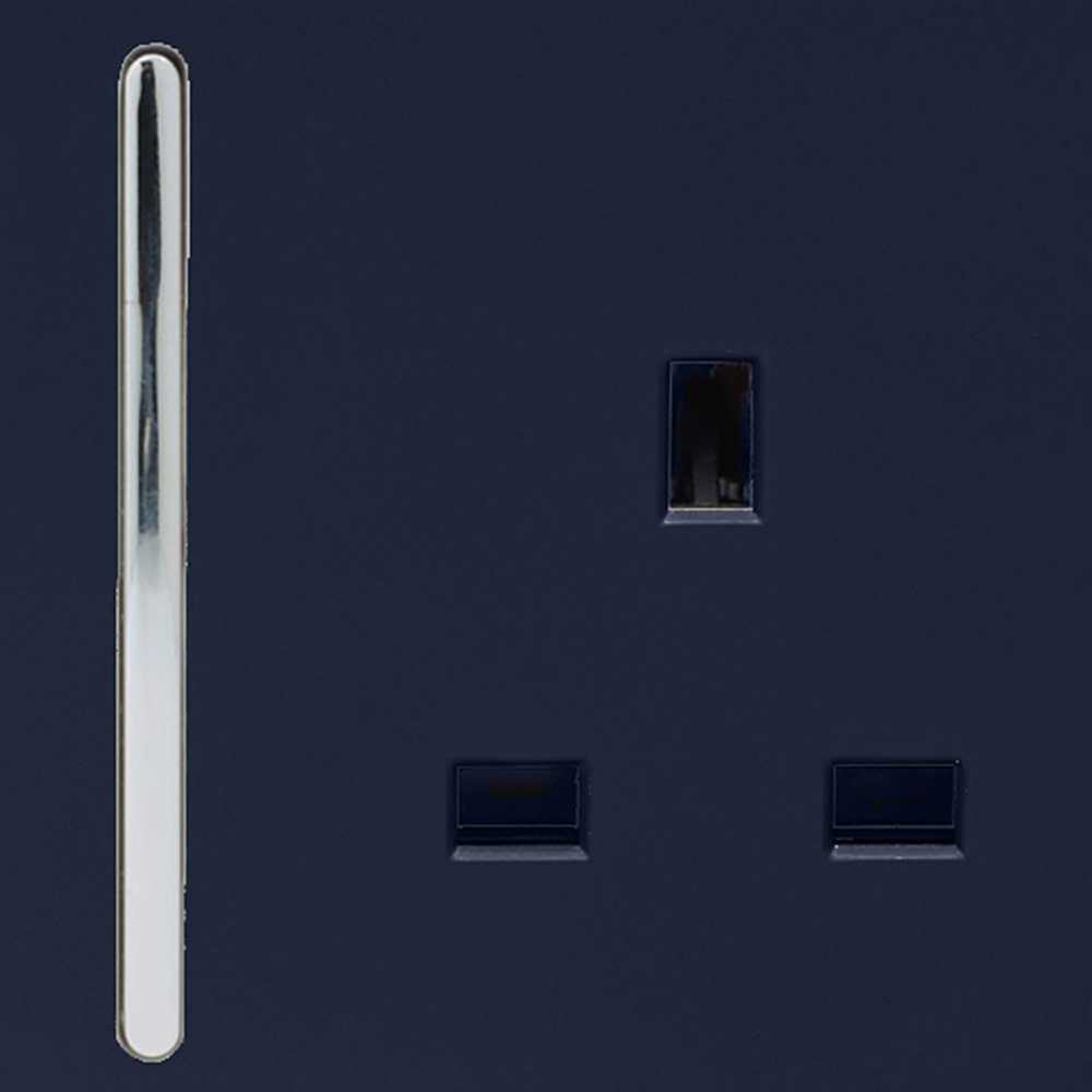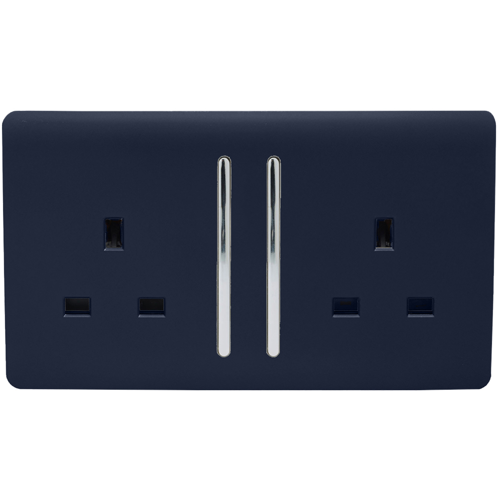 Step up your space with the Trendi Switch 2 Gang 13amp Navy Blue Long Switched Plug Socket. Crafted from high-quality, fireproof ABS plastic in navy blue, it features a sleek chrome rocker switch on a screwless design. Installation is effortless, replace the old switch by removing and clicking the new faceplate. Its matte black polished surface ensures lasting elegance, resistant to fading in sunlight. Ideal for modern setups, this socket offers 13amp capacity.