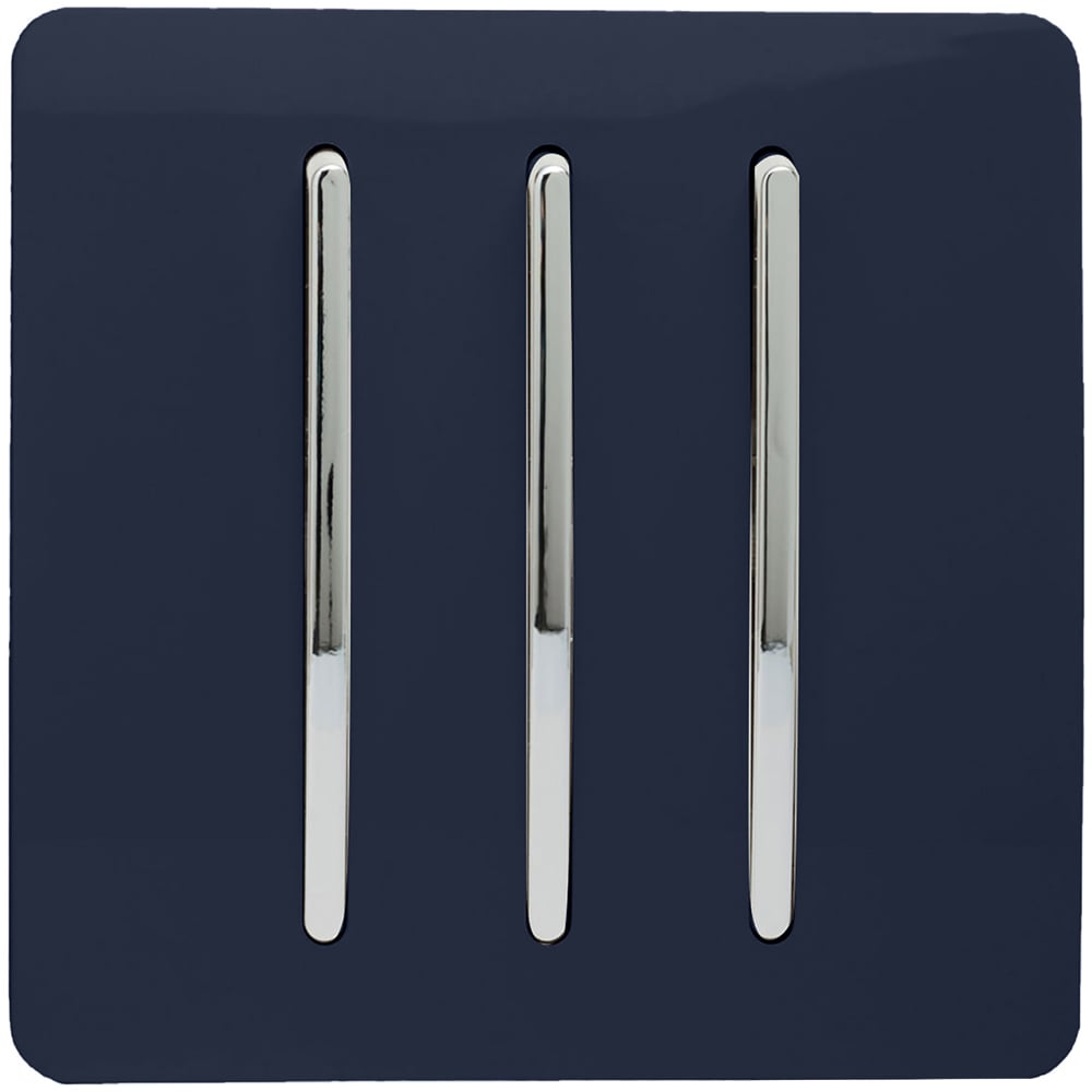 Elevate your home lighting with the Trendi Switch 3 Gang 10amp 1 or 2 Way Navy Blue Rocker Light Switch. Crafted from high-quality fireproof ABS plastic, this switch combines durability with a sleek, modern design. It features a screwless plate that displays the complete colour of the product. This screwless plate offers a seamless, polished appearance, making it a stylish addition to any contemporary space. The back frame, which houses the screw holes and module, ensures compatibility with standard back boxes and wiring systems. Installation is effortless with no additional wiring required; the old switch can be easily replaced by removing the faceplate and clicking the new one into the place. Also, it is easy to clean. The light switch faceplate's matt black surface ensures the socket maintains its elegant look even in direct sunlight.