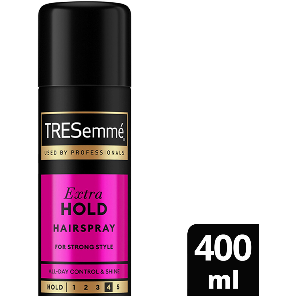 2 x of 400 ml Tresemme Extra Hold Long-lasting Finish Fast Drying Hairspray. Get set with the pro performance hairsprays. Whether you want to fully secure your look or to help take control of your frizz for 24 hours, TRESemme has a range of hairsprays to meet the level of hold you need. To freeze your look in a flash, why not try a TRESemme hard hold hairspray with level 5 hold to ensure your updos will not fall flat with this hardworking product. For a lighter all-day touchable hold try a level 3, allowing your locks to move naturally whilst giving you the control and grip you need to help tame frizz and flyaway. All TRESemme hairsprays are non-sticky to the touch and brush out easily. To apply TRESemme Hairspray, spray from 10-12 inches away from your dry hair, one section at a time. For a stronger hold, layer more coats just where you want more control. For maximum fullness, flip your hair upside down and mist all over to set. Putting pro performance in your hands every day.